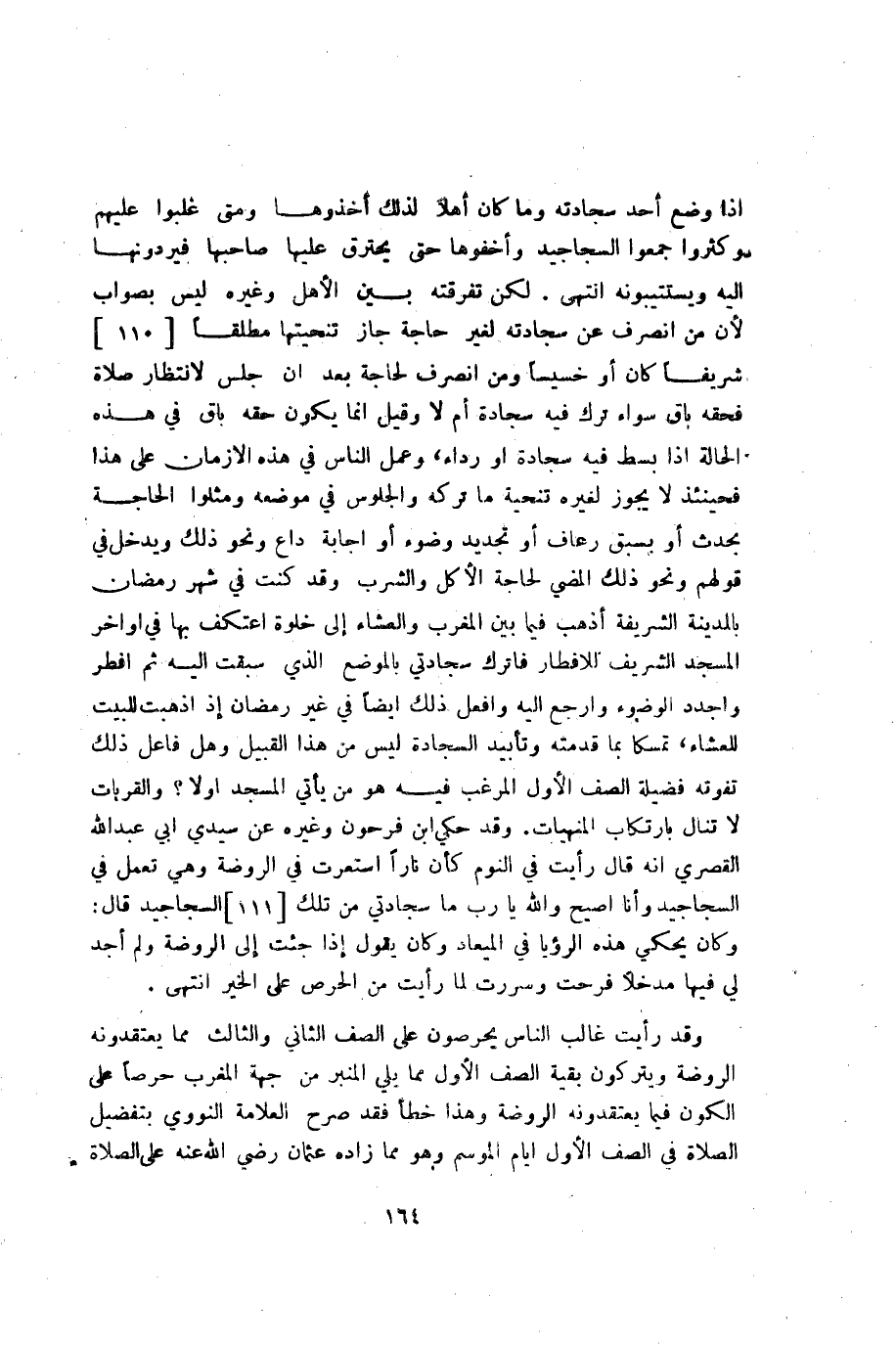 …لكن تفرقته بين الأهل وغيره ليس بصواب لأن من انصرف عن سجادته لغير حاجة جاز تنحيتها مطلقاً شريفاً كان أو خسيساً ومن انصرف لحاجة بعد أن جلس لانتظار صلاة فحقه باق سواء ترك فيه سجادة أم لا وقيل إنما يكون حقه باق في هذه الحالة إذا بسط فيه سجادة أو رداء، وعمل الناس في هذه الزمان على هذا فحين إذ لا يجوز لغيره تنحية ما تركه والجلوس في موضعه ومثلوا الحاجة بحدث أو بسبق رعاف أو تجديد وضوء أو إجابة داع ونحو ذلك ويدخل في قولهم ونحو ذلك المضي لحاجة الأكل والشرب وقد كنت في شهر رمضان بالمدينة الشريفة أذهب فيما بين المغرب والعشاء إلى خلوة أعتكف بها في أواخر المسجد الشريف للإفطار وأترك سجادتي بالموضع الذي سبقت إليه ثم أفطر وأجدد الوضوء وأرجع إليه وأفعل ذلك أيضاً في غير رمضان إذا ذهبت للبيت للعشاء، تمسكاً بما قدمته وتأبيد السجادة ليس من هذا القبيل وهل فعل ذلك تفوته فضيلة الصف الأول المرغب فيه هو ومن يأتي المسجد أولاً؟ والقربات لا تنال بارتكاب المنهيات.