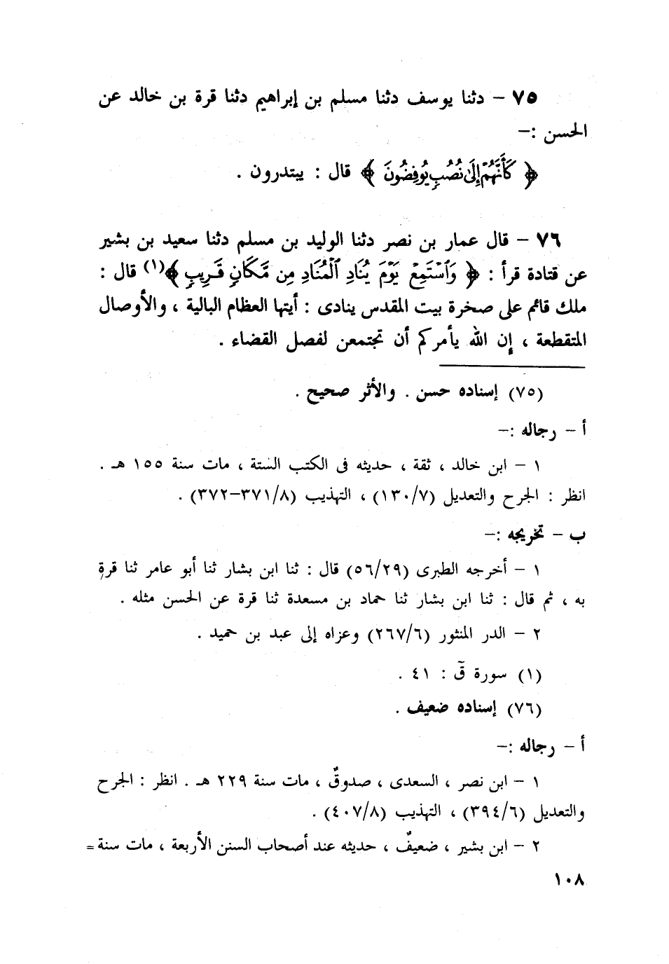 149 - دثني حَمْزَةُ بْنُ الْعَبَّاسِ، ادنا عَبْدُ اللَّهِ بْنُ عُثْمَانَ، ادنا ابْنُ الْمُبَارَكِ، ادنا مَالِكُ بْنُ مِغْوَلٍ، عَنْ عُبَيْدِ اللَّهِ بْنِ الْعَيْزَارِ قَالَ: " إِنَّ §الْأَقْدَامَ يَوْمَ الْقِيَامَةِ مِثْلُ النَّبْلِ فِي الْقَرْنِ، فَالسَّعِيدُ الَّذِي يَجِدُ لِقَدَمَيْهِ مَوْضِعًا يَضَعَهُمَا، وَإِنَّ الشَّمْسَ تَدْنُو مِنْ رُءُوسِهِمْ حَتَّى لَا يَكُونَ بَيْنَهَا وَبَيْنَ رُءُوسِهِمْ، إِمَّا قَالَ: مِيلًا أَوْ مِيلَيْنِ، وَيُزَادُ فِي حَرِّهَا بَضْعَةٌ وَسِتُّونَ ضِعْفًا "