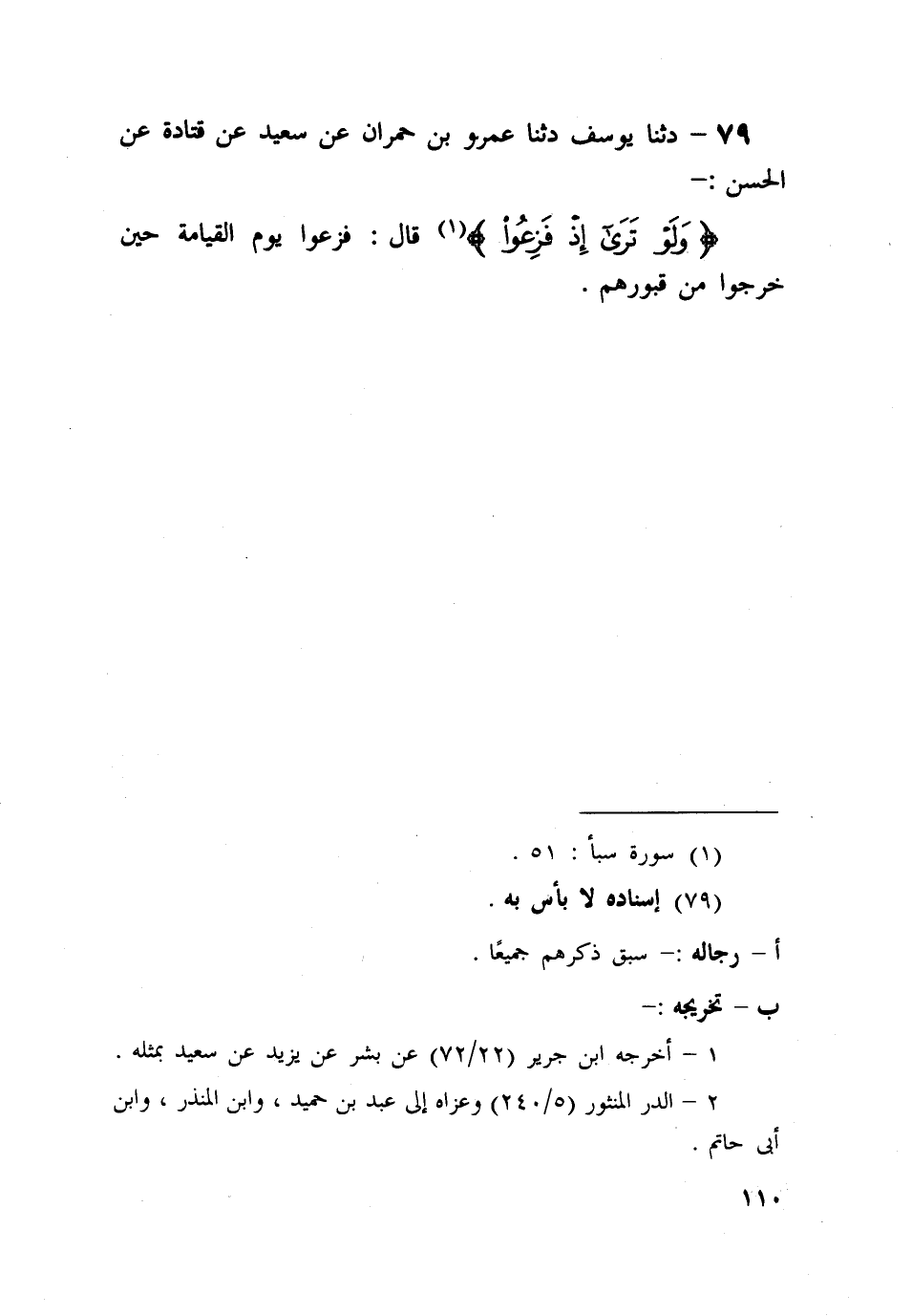 151 - دثنا سُرَيْجُ بْنُ يُونُسَ، دثنا أَبُو سُفْيَانَ، عَنْ مَعْمَرٍ، عَنْ أَبِي إِسْحَاقَ، عَنْ صِلَةَ بْنِ زُفَرَ، عَنْ حُذَيْفَةَ قَالَ: " §يُجْمَعُ النَّاسُ يَوْمَ الْقِيَامَةِ فِي صَعِيدٍ وَاحِدٍ، يُسْمِعُهُمُ الدَّاعِيَ، وَيَنْفُذُهُمُ الْبَصَرُ، كَمَا خُلِقُوا أَوَّلَ مَرَّةٍ، ثُمَّ يَقُومُ النَّبِيُّ صَلَّى اللهُ عَلَيْهِ وَسَلَّمَ فَيَقُولُ: «لَبَّيْكَ وَسَعْدَيْكَ، وَالْخَيْرُ فِي يَدَيْكَ، وَالشَّرُّ لَيْسَ إِلَيْكَ، وَالْمَهْدِيُّ مَنْ هَدَيْتَ، عِبَادُكَ بَيْنَ يَدَيْكَ، أَنَا مِنْكَ وَإِلَيْكَ، سُبْحَانَكَ رَبَّ الْبَيْتِ، تَبَارَكْتَ وَتَعَالَيتَ» ، قَالَ: «وَهُوَ الْمَقَامُ الْمَحْمُودُ»