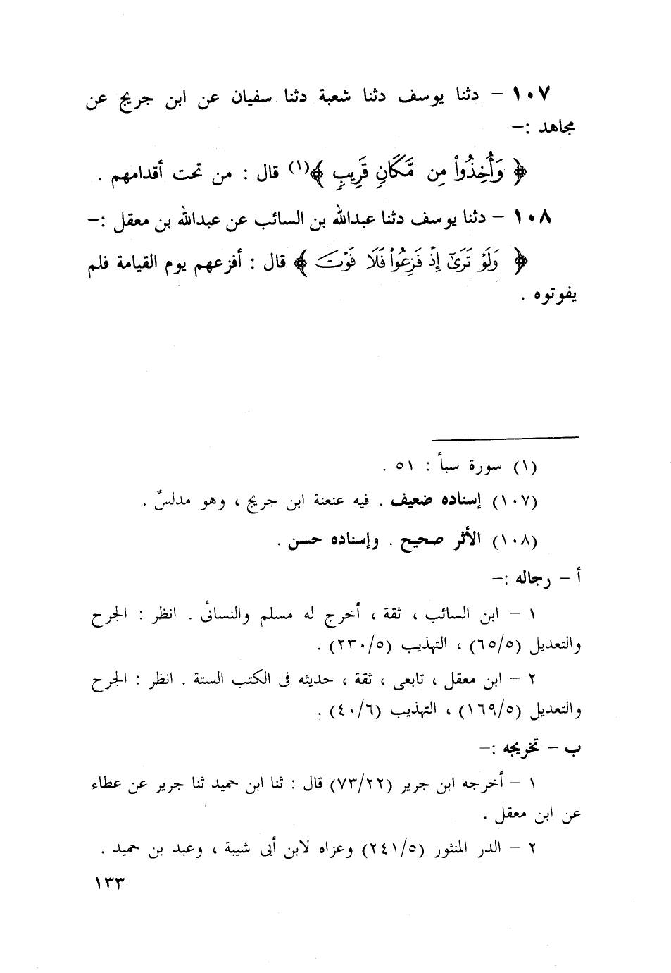 171 - دثنا حَمْزَةُ بْنُ الْعَبَّاسِ، ادنا عَبْدُ اللَّهِ بْنُ عُثْمَانَ، ادنا ابْنُ الْمُبَارَكِ، ادنا عَبْدُ الرَّحْمَنِ بْنُ يَزِيدَ بْنِ جَابِرٍ، دثنا عَبْدُ الْجَبَّارِ بْنُ عُبَيْدِ اللَّهِ بْنِ سَلْمَانَ، قَالَ: قَوْلُ الْمُؤْمِنِ حِينَ يَقُولُ لِقَوْمِهِ: {إِنِّي أَخَافُ عَلَيْكُمْ يَوْمَ التَّنَادِ يَوْمَ تُوَلُّونَ مُدْبِرِينَ} [غافر: 33] ، قَالَ: «§يُرْسَلُ عَلَيْهِمْ مِنَ اللَّهِ أَمْرٌ فَيُوَلُّونَ مُدْبِرِينَ، ثُمَّ تَسْتَجِيبُ لَهُمْ أَعْيُنُهُمْ بِالدَّمْعِ، فَيَبْكُونَ حَتَّى يَنْفَدَ الدَّمْعُ، ثُمَّ تَسْتَجِيبُ لَهُمْ أَعْيُنُهُمْ بِالدَّمِ فَيَبْكُونَ دَمًا، حَتَّى يَنْفَدَ الدَّمُ، ثُمَّ تَسْتَجِيبُ لَهُمْ أَعْيُنُهُمْ بِالْقَيْحِ، فَيَبْكُونَ حَتَّى يَنْفَدَ الْقَيْحُ، وَتَعُودُ أَبْصَارُهُمْ كَالْحِدَقِ بِالطِّينِ»