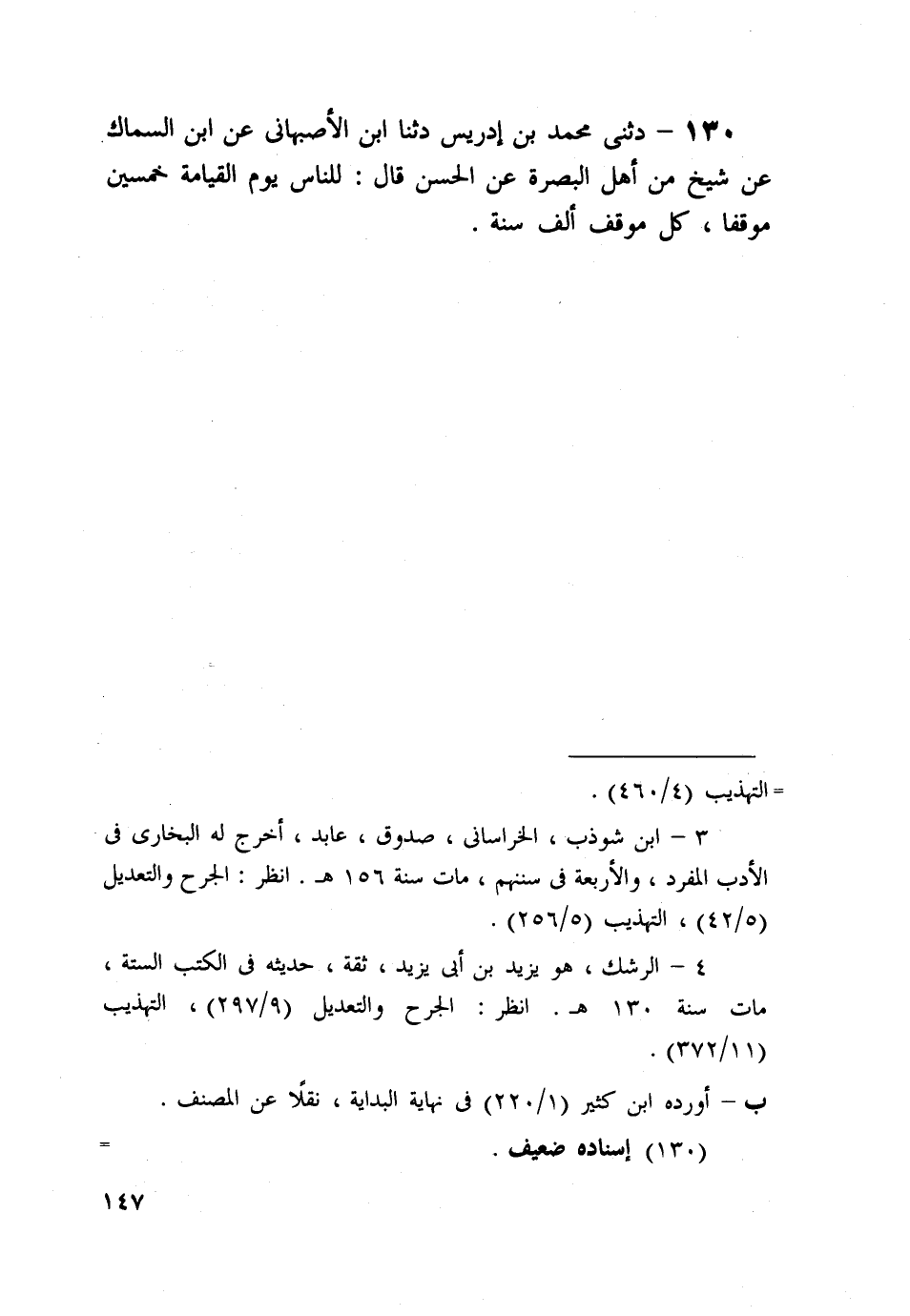 181 - دثنا أَبُو خَيْثَمَةَ، دثنا جَرِيرٌ، عَنِ الْأَعْمَشِ، عَنْ مُنْذِرٍ أَبِي يَعْلَى، عَنْ أَشْيَاخِ، التَّيْمِ، عَنْ أَبِي ذَرٍّ قَالَ: بَيْنَمَا أَنَا جَالِسٌ عِنْدَ رَسُولِ اللَّهِ صَلَّى اللهُ عَلَيْهِ وَسَلَّمَ وَشَاتَانِ تَأْكُلَانِ مِنْ عَلَفٍ لَهُمَا انْتَطَحَتَا، فَقَالَ: «يَا أَبَا ذَرٍّ، فِيمَا تَنْتَطِحُ هَاتَانِ الشَّاتَانِ؟» ، قَالَ: لَا أَدْرِي، قَالَ: «لَكِنَّ §اللَّهَ يَدْرِي وَسَيَقْضِي بَيْنَهُمَا»