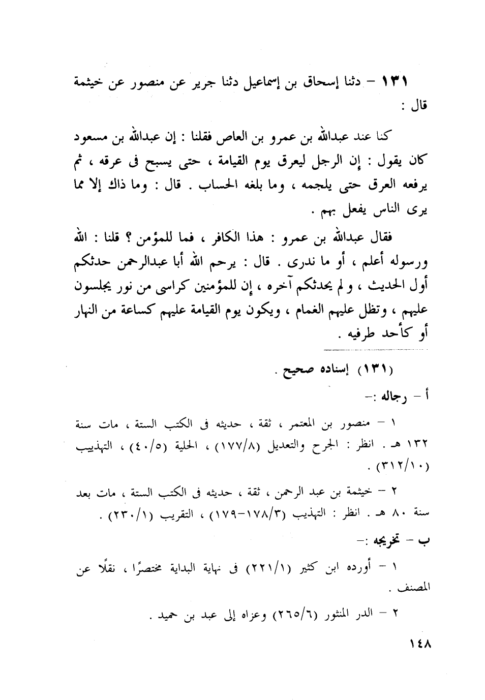 183 - دثنا مُحَمَّدُ بْنُ عَبْدِ اللَّهِ الْمَدِينِيُّ، دثنا الْمُعْتَمِرُ بْنُ سُلَيْمَانَ، قَالَ: سَمِعْتُ أَبِي، عَنِ الْقَاسِمِ بْنِ أَبِي بَزَّةَ، فِي قَوْلِهِ: {§وَمَا مِنْ دَابَّةٍ فِي الْأَرْضِ وَلَا طَائِرٍ يَطِيرُ بِجَنَاحَيْهِ إِلَّا أُمَمٌ أَمْثَالُكُمْ مَا فَرَّطْنَا فِي الْكِتَابِ مِنْ شَيْءٍ ثُمَّ إِلَى رَبِّهِمْ يُحْشَرُونَ} [الأنعام: 38] قَالَ: " يُؤْتَى بِهِمْ وَالنَّاسُ وُقُوفٌ فَيُقْضَى بَيْنَهُمْ، حَتَّى إِنَّهُ لَيُؤْخَذُ لِلْجَمَّاءِ مِنَ الْقَرْنَاءِ لِقَهْرِهَا إِيَّاهَا، وَحَتَّى يُقَادُ لِلذَّرَّةِ مِنَ الذَّرَّةِ، ثُمَّ يُقَالُ لَهُمْ: كُونُوا تُرَابًا، قَالَ: ثُمَّ يَقُولُ الْكَافِرُ: {يَا لَيْتَنِي كُنْتُ تُرَابًا} [النبأ: 40] "