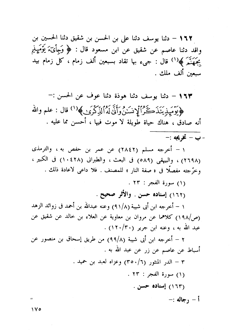216 - دثني مُحَمَّدُ بْنُ الْحُسَيْنِ، دثنا حَكِيمُ بْنُ جَعْفَرٍ، عَنْ صَالِحٍ الْمُرِّيِّ، قَالَ: " §دَخَلْتُ الْمَقَابِرَ نِصْفَ النَّهَارُ فَنَظَرْتَ إِلَى الْقُبُورِ خَامِدَةً، كَأَنَّهُمْ قَوْمٌ صُمُوتٌ، فَقُلْتُ: سُبْحَانَ مَنْ يُحْيِيكُمْ وَيَنْشُرُكُمْ مِنْ بَعْدِ طُولِ الْبِلَى، فَهَتَفَ هَاتِفٌ مِنْ بَعْضِ تِلْكَ الْحُفَرِ: يَا صَالِحُ: {وَمِنْ آيَاتِهِ أَنْ تَقُومَ السَّمَاءُ وَالْأَرْضُ بِأَمْرِهِ ثُمَّ إِذَا دَعَاكُمْ دَعْوَةً مِنَ الْأَرْضِ إِذَا أَنْتُمْ تَخْرُجُونَ} [الروم: 25] قَالَ: فَخَرَرْتُ وَاللَّهِ مَغْشِيًّا عَلَيَّ "