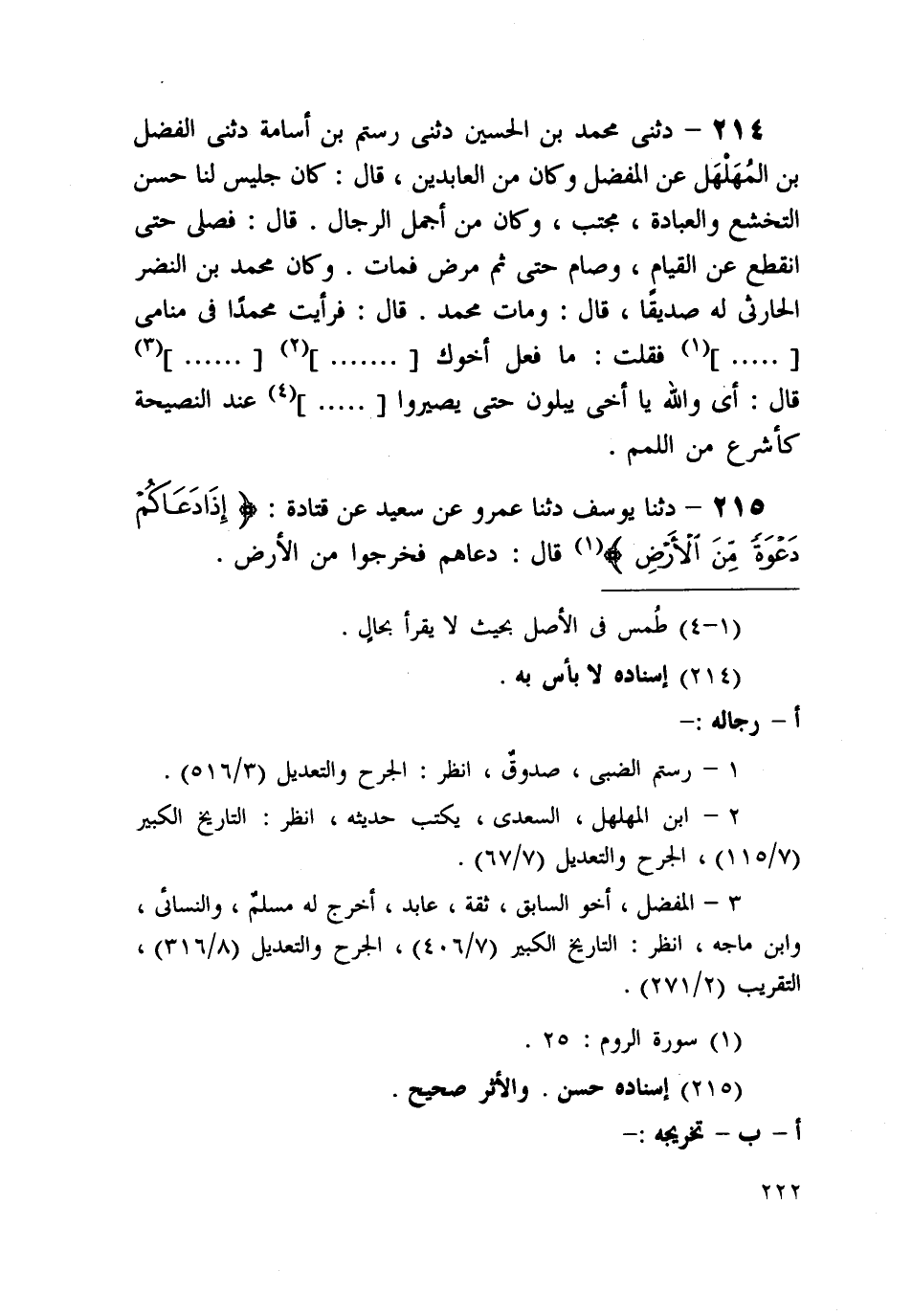 267 - دثني الْقَاسِمُ بْنُ هَاشِمٍ، ادنا مُسْلِمُ بْنُ إِبْرَاهِيمَ، دثني الرِّيَاحِيُّ، دثنا. . . . . لَطَمَ ابْنٌ لَهُ مَمْلُوكًا لَهُ لَطْمَةً، فَقَالَ أَبُو مُسْلِمٍ لِلْمَمْلُوكِ: «قُمْ فَاضْرِبَ الْمَوْضِعَ. . . . §قِصَاصُ الْيَوْمِ خَيْرٌ مِنَ الْقِصَاصِ غَدًا»