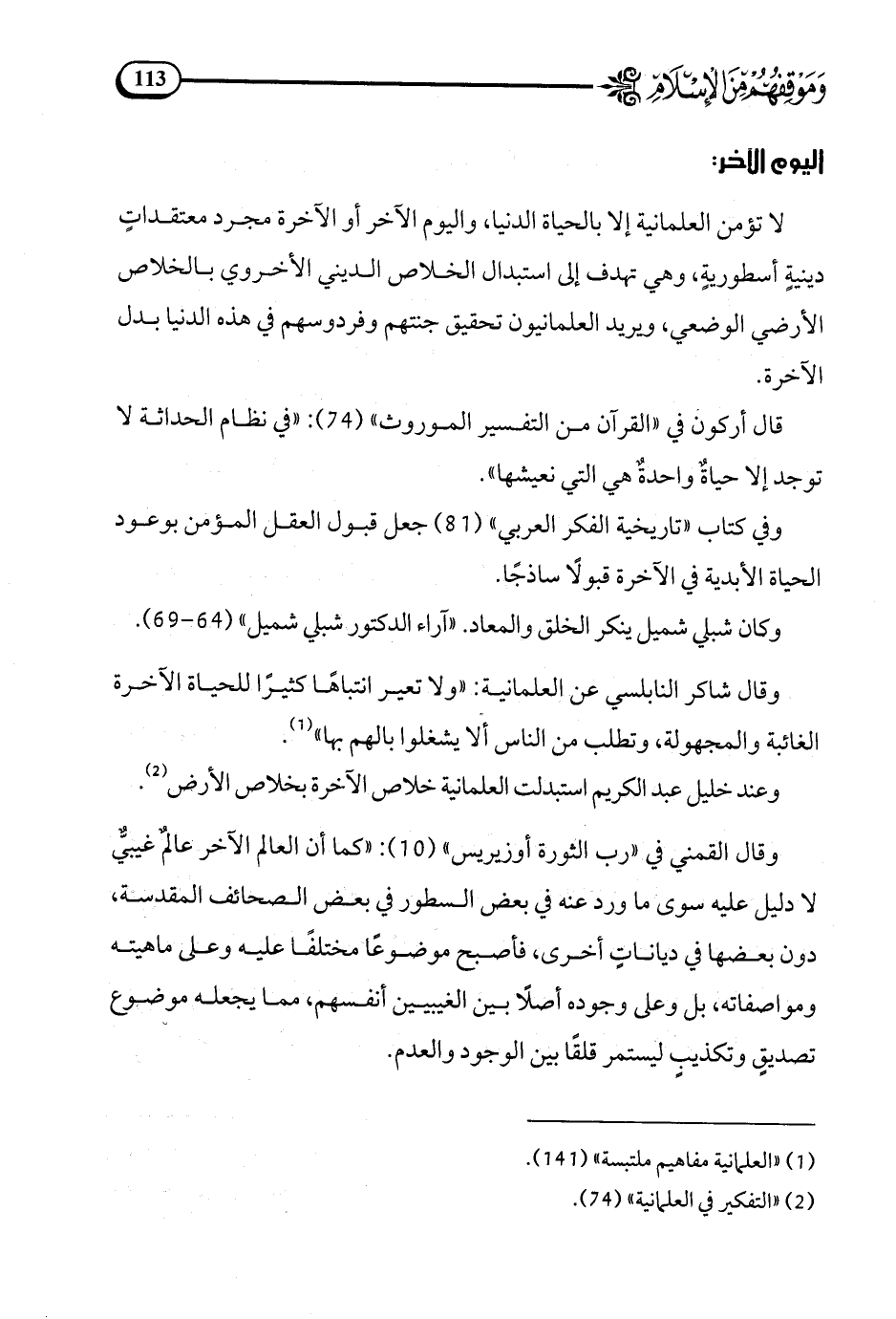 قال أركون في القرآن من التفسير الموروث (74): في نظام الحداثة لا توجد إلا حياة واحدة هي التي نعيشها.