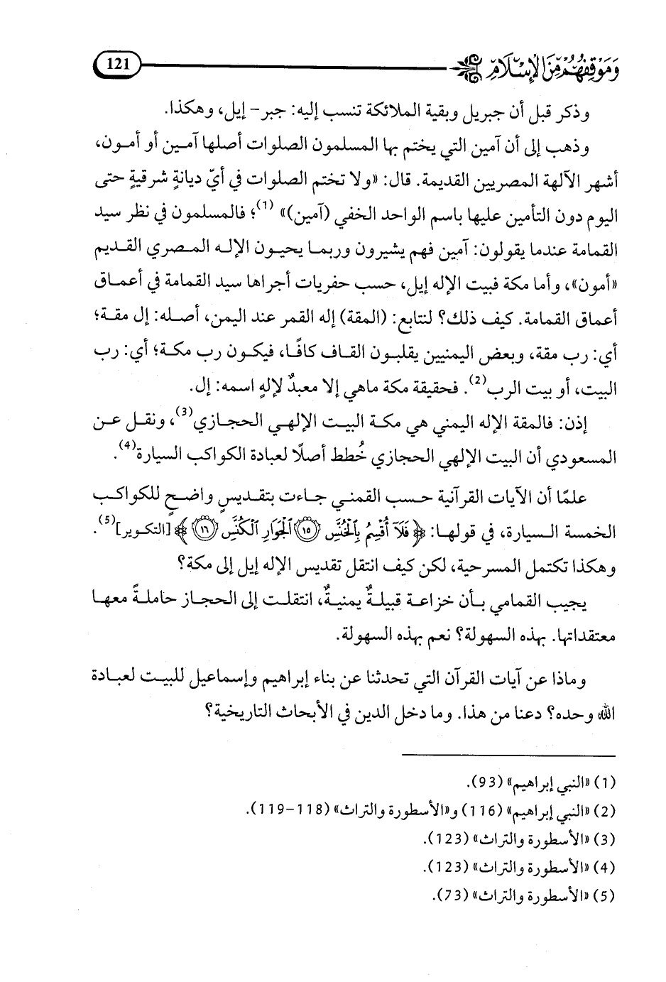 علما أن الآيات القرآنية حسب القمني جاءت بتقديس واضح للكواكب الخمسة السيارة، في قولها: {فَلَا أُقْسِمُ بِالْخُنَّسِ الْجَوَارِ الْكُنَّسِ} التكوير15 - 16 (¬5).