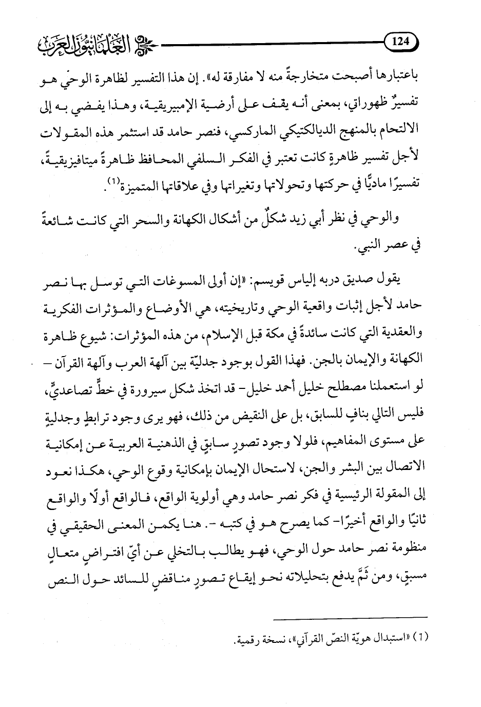 باعتبارها أصبحت متخارجة منه لا مفارقة له. إن هذا التفسير لظاهرة الوحي هو تفسير ظهوراتي، بمعنى أنه يقف على أرضية الإمبيريقية وهذا يفضي به إلى الالتحام بالمنهج الديالكتيكي الماركسي، فنصر حامد قد استثمر هذه المقولات لأجل تفسير ظاهرة كانت تعتبر في الفكر السلفي/المحافظ ظاهرة ميتافيزيقية، تفسيرا ماديا في حركتها وتحولاتها وتغيراتها وفي علاقاتها المتميزة (¬1).
