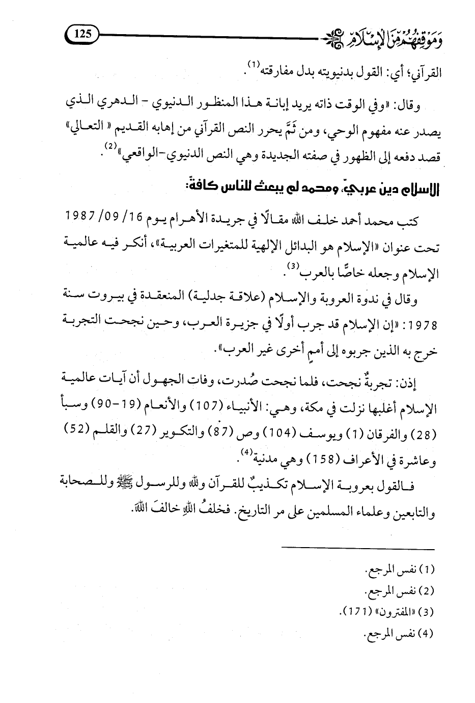كتب محمد أحمد خلف الله مقالا في جريدة الأهرام يوم 16/ 09/1987 تحت عنوان الإسلام هو البدائل الإلهية للمتغيرات العربية، أنكر فيه عالمية الإسلام وجعله خاصا بالعرب (¬3).