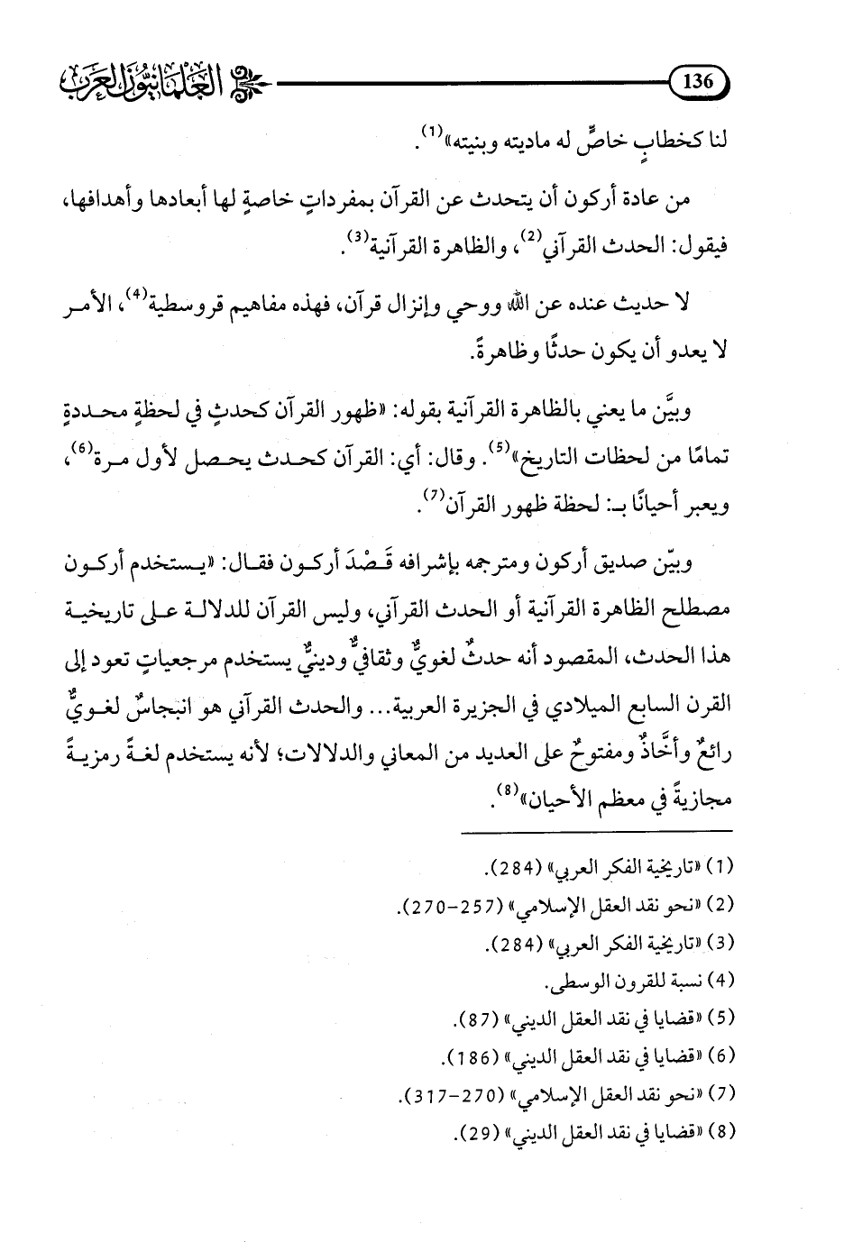 وبيَّن ما يعني بالظاهرة القرآنية بقوله: ظهور القرآن كحدث في لحظة محددة تماما من لحظات التاريخ (¬5).