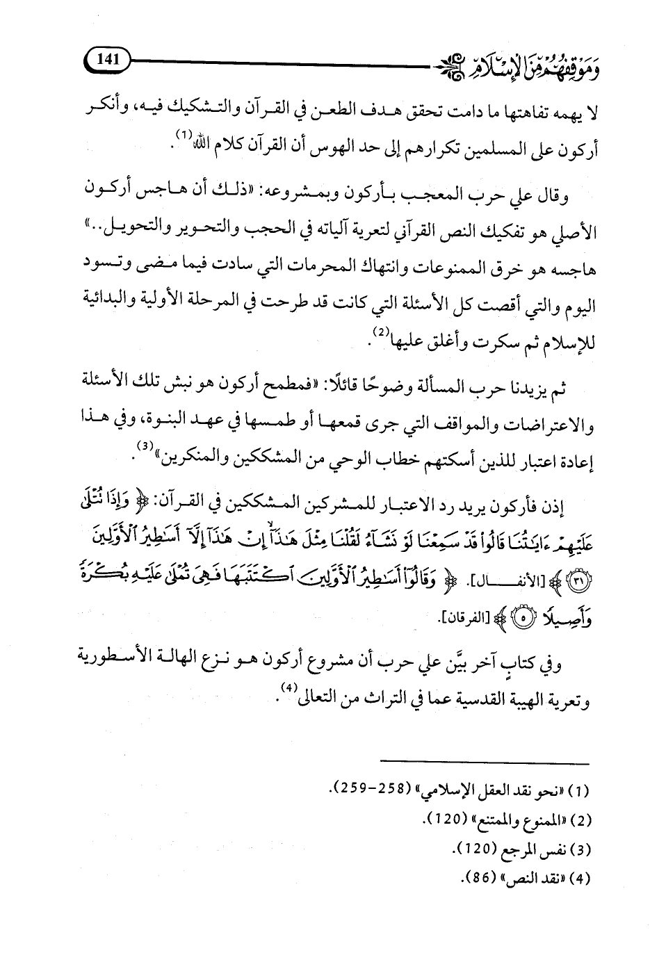 إذن فأركون يريد رد الاعتبار للمشركين المشككين في القرآن: {وَإِذَا تُتْلَى عَلَيْهِمْ آيَاتُنَا قَالُواْ قَدْ سَمِعْنَا لَوْ نَشَاء لَقُلْنَا مِثْلَ هَذَا إِنْ هَذَا إِلاَّ أَسَاطِيرُ الأوَّلِينَ} الأنفال31.
