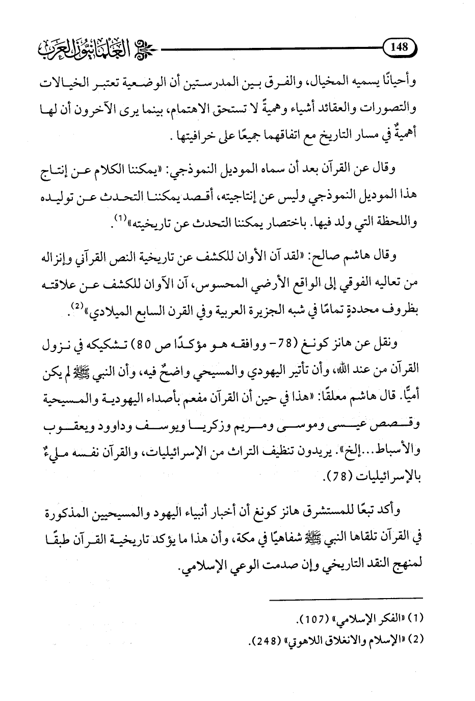 ونقل عن هانز كونغ (78 - ووافقه هو مؤكدا ص 80) تشكيكه في نزول القرآن من عند الله، وأن تأتير اليهودي والمسيحي واضح فيه، وأن النبي - صلى الله عليه وسلم - لم يكن أميا. قال هاشم معلقا: هذا في حين أن القرآن مفعم بأصداء اليهودية والمسيحية وقصص عيسى وموسى ومريم وزكريا ويوسف وداوود ويعقوب والأسباط ... إلخ. يريدون تنظيف التراث من الإسرائيليات والقرآن نفسه مليء بالإسرائيليات (78).