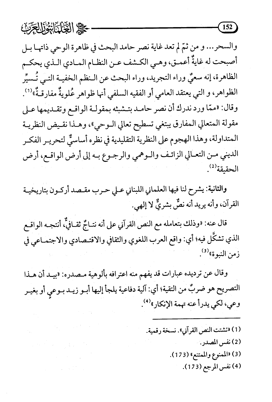 والسحر ... ومن ثمّ لم تعد غاية نصر حامد البحث في ظاهرة الوحي ذاتها بل أصبحت له غاية أعمق، وهي الكشف عن النظام المادي الذي يحكم الظاهرة، إنه سعي وراء التجريد، وراء البحث عن النظم الخفية التي تسير الظواهر والتي يعتقد العامي أو الفقيه السلفي أنها ظواهر عُلوية مفارقة (¬1).