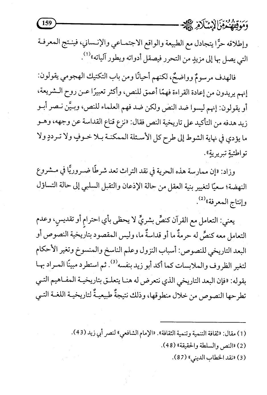 وليس المقصود بتاريخية النصوص أو البعد التاريخي للنصوص: أسباب النزول وعلم الناسخ والمنسوخ وتغير الأحكام لتغير الظروف والملابسات كما أكد أبو زيد بنفسه (¬3).