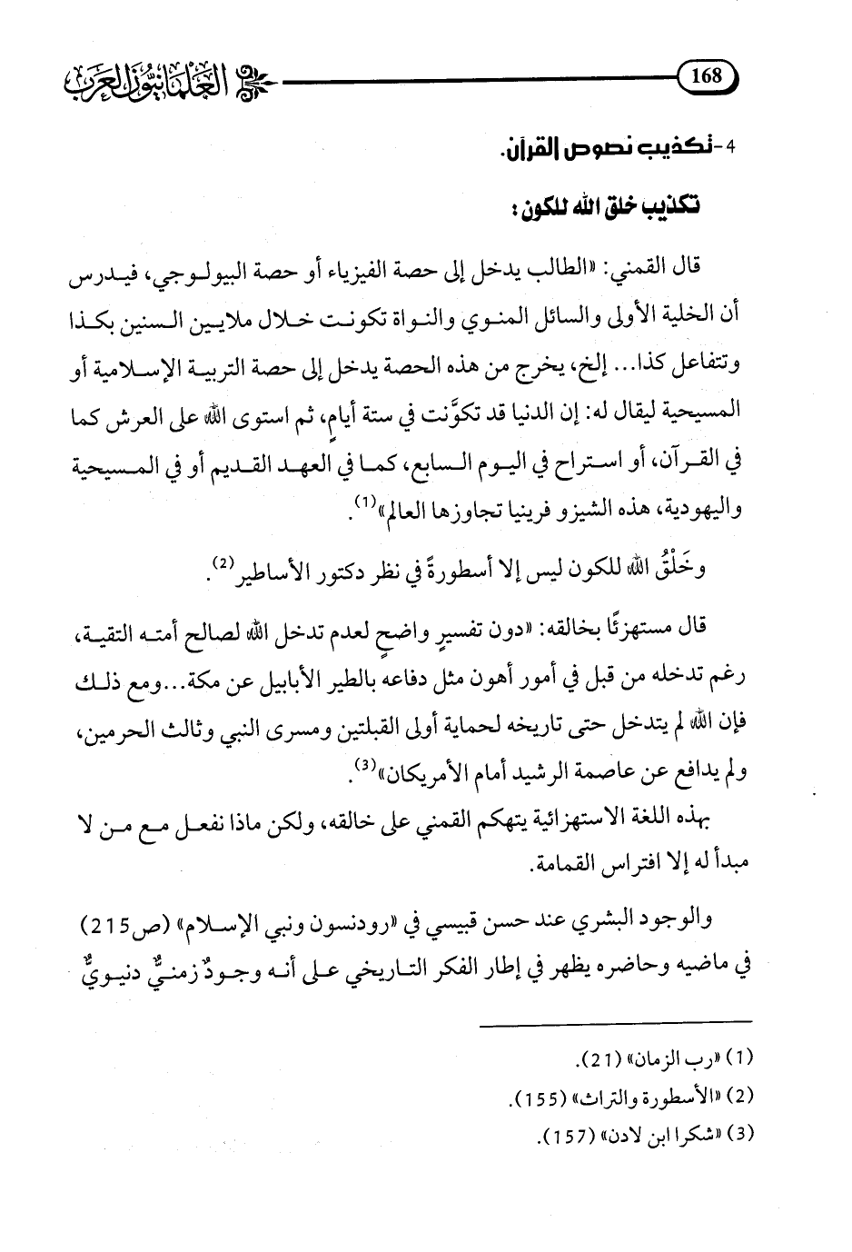 قال القمني: الطالب يدخل إلى حصة الفيزياء أو حصة البيولوجي فيدرس أن الخلية الأولى والسائل المنوي والنواة تكونت خلال ملايين السنين بكذا وتتفاعل كذا إلخ، يخرج من هذه الحصة يدخل إلى حصة التربية الإسلامية أو المسيحية ليقال له: إن الدنيا قد تكونت في ستة أيام ثم استوى الله على العرش كما في القرآن أو استراح في اليوم السابع، كما في العهد القديم أو في المسيحية واليهودية، هذه الشيزو فرينيا تجاوزها العالم (¬1).