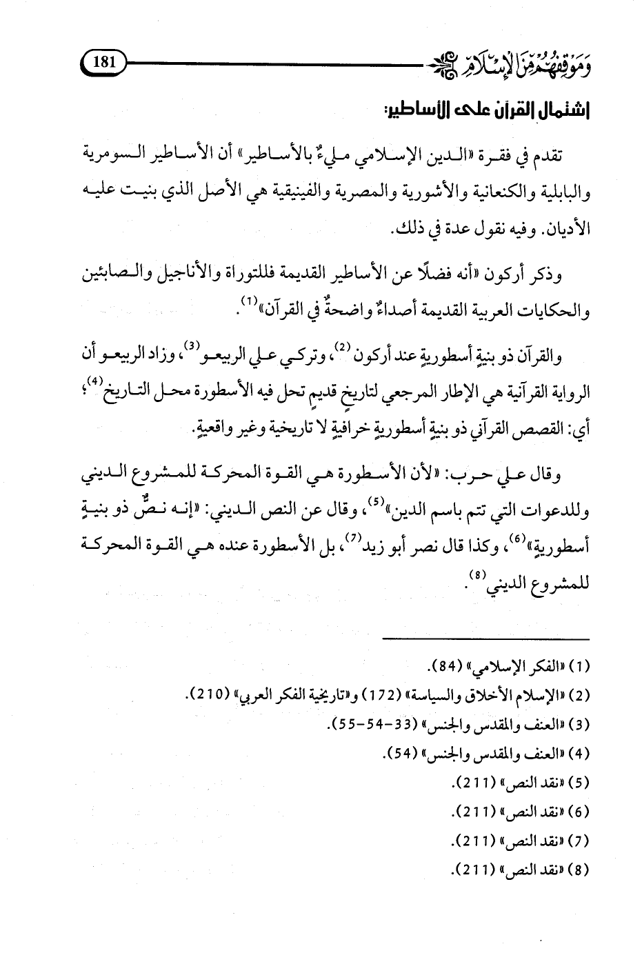 وقال عن النص الديني: إنه نص ذو بنية أسطورية (¬6).