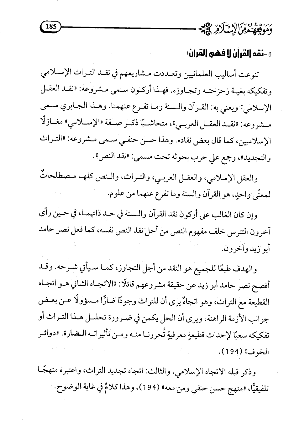 وذكر قبله الاتجاه الإسلامي، والثالث: اتجاه تجديد التراث، واعتبره منهجا تلفيقيا، منهج حسن حنفي ومن معه (194).