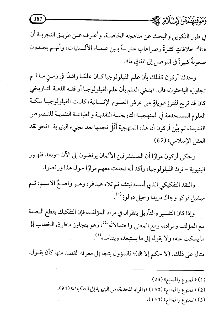 ثم بيَّن أركون أن هذه المنهجية أفل نجمها بعد مجيء البنيوية. نحو نقد العقل الإسلامي (67).