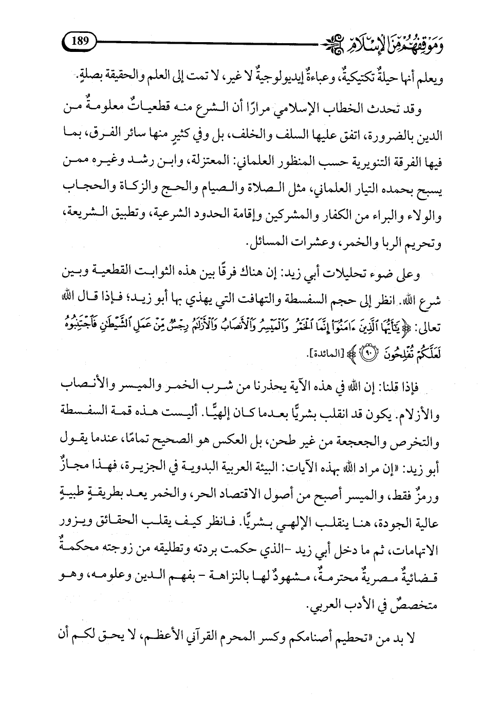 بل العكس هو الصحيح تماما، عندما يقول أبو زيد: إن مراد الله بهذه الآيات البيئة العربية البدوية في الجزيرة، فهذا مجاز ورمز فقط، والميسر أصبح من أصول الاقتصاد الحر، والخمر يعد بطريقة طبية عالية الجودة.