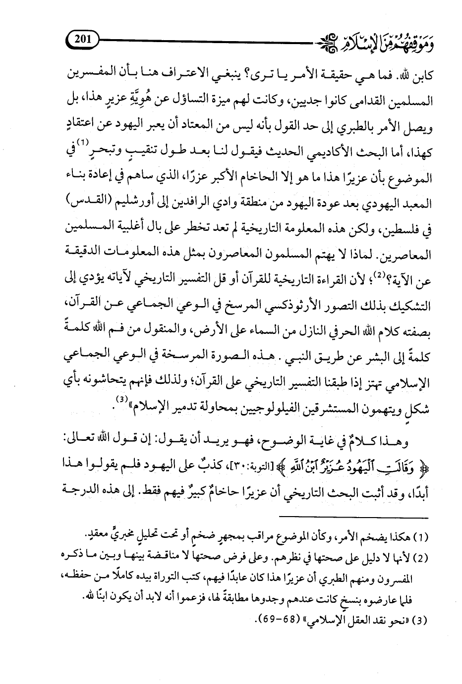 كابن لله. فما هي حقيقة الأمر يا ترى؟ ينبغي الاعتراف هنا بأن المفسرين المسلمين القدامى كانوا جديين، وكانت لهم ميزة التساؤل عن هوية عزير هذا. بل ويصل الأمر بالطبري إلى حد القول بأنه ليس من المعتاد أن يعبر اليهود عن اعتقاد كهذا. أما البحث الأكاديمي الحديث فيقول لنا بعد طول تنقيب وتبحر (¬1) في الموضوع بأن عزير هذا ما هو إلا الحاخام الأكبر عزرا الذي ساهم في إعادة بناء المعبد اليهودي بعد عودة اليهود من منطقة وادي الرافدين إلى أورشليم (القدس) في فلسطين. ولكن هذه المعلومة التاريخية لم تعد تخطر على بال أغلبية المسلمين المعاصرين. لماذا لا يهتم المسلمون المعاصرون بمثل هذه المعلومات الدقيقة عن الآية؟ (¬2) لأن القراءة التاريخية للقرآن أو قل التفسير التاريخي لآياته يؤدي إلى التشكيك بذلك التصور الأرثوذكسي المرسخ في الوعي الجماعي عن القرآن بصفته كلام الله الحرفي النازل من السماء على الأرض والمنقول من فم الله كلمة كلمة إلى البشر عن طريق النبي. هذه الصورة المرسخة في الوعي الجماعي الإسلامي تهتز إذا طبقنا التفسير التاريخي على القرآن. ولذلك فإنهم يتحاشونه بأي شكل ويتهمون المستشرقين الفيلولوجيين بمحاولة تدمير الإسلام (¬3).