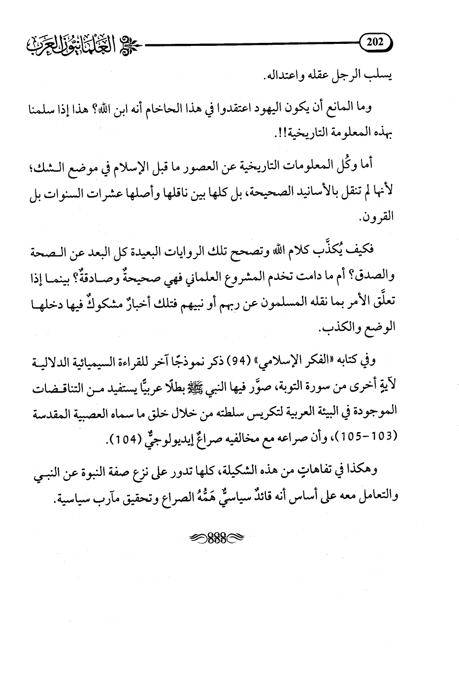 وهكذا في تفاهات من هذا الشكيلة، كلها تدور على نزع صفة النبوة عن النبي والتعامل معه على أساس أنه قائد سياسي همه الصراع وتحقيق مآرب سياسية.