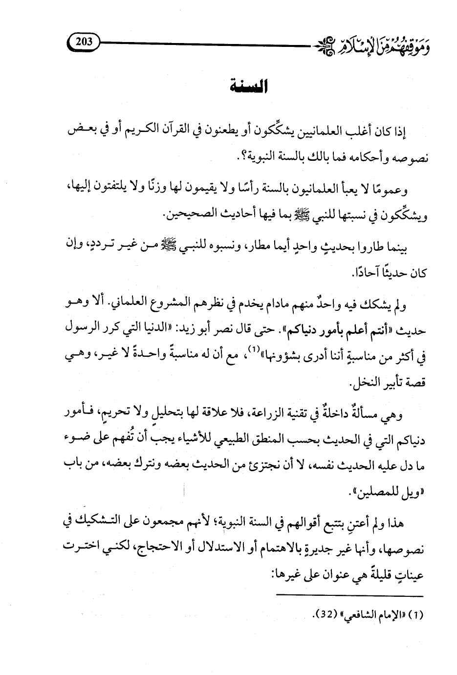 ولم يشكك فيه واحد منهم مادام يخدم في نظرهم المشروع العلماني. ألا وهو حديث «أنتم أعلم بأمور دنياكم». حتى قال نصر أبو زيد: الدنيا التي كرر الرسول في أكثر من مناسبة أننا أدرى بشؤونها (¬1).