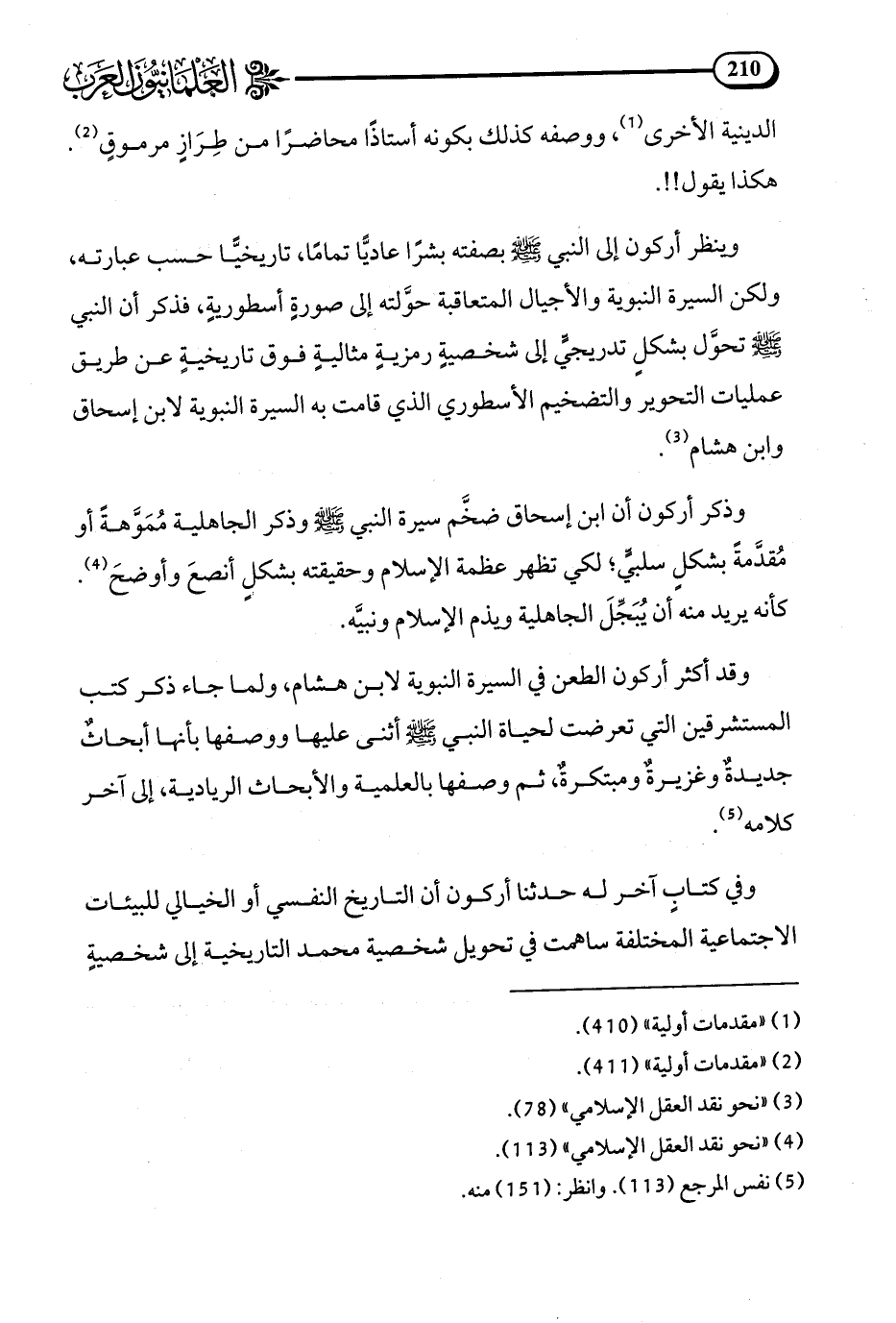 وقد أكثر أركون الطعن في السيرة النبوية لابن هشام، ولما جاء ذكر كتب المستشرقين التي تعرضت لحياة النبي - صلى الله عليه وسلم - أثنى عليها ووصفها بأنها أبحاث جديدة وغزيرة ومبتكرة، ثم وصفها بالعلمية والأبحاث الريادية، إلى آخر كلامه (¬5).