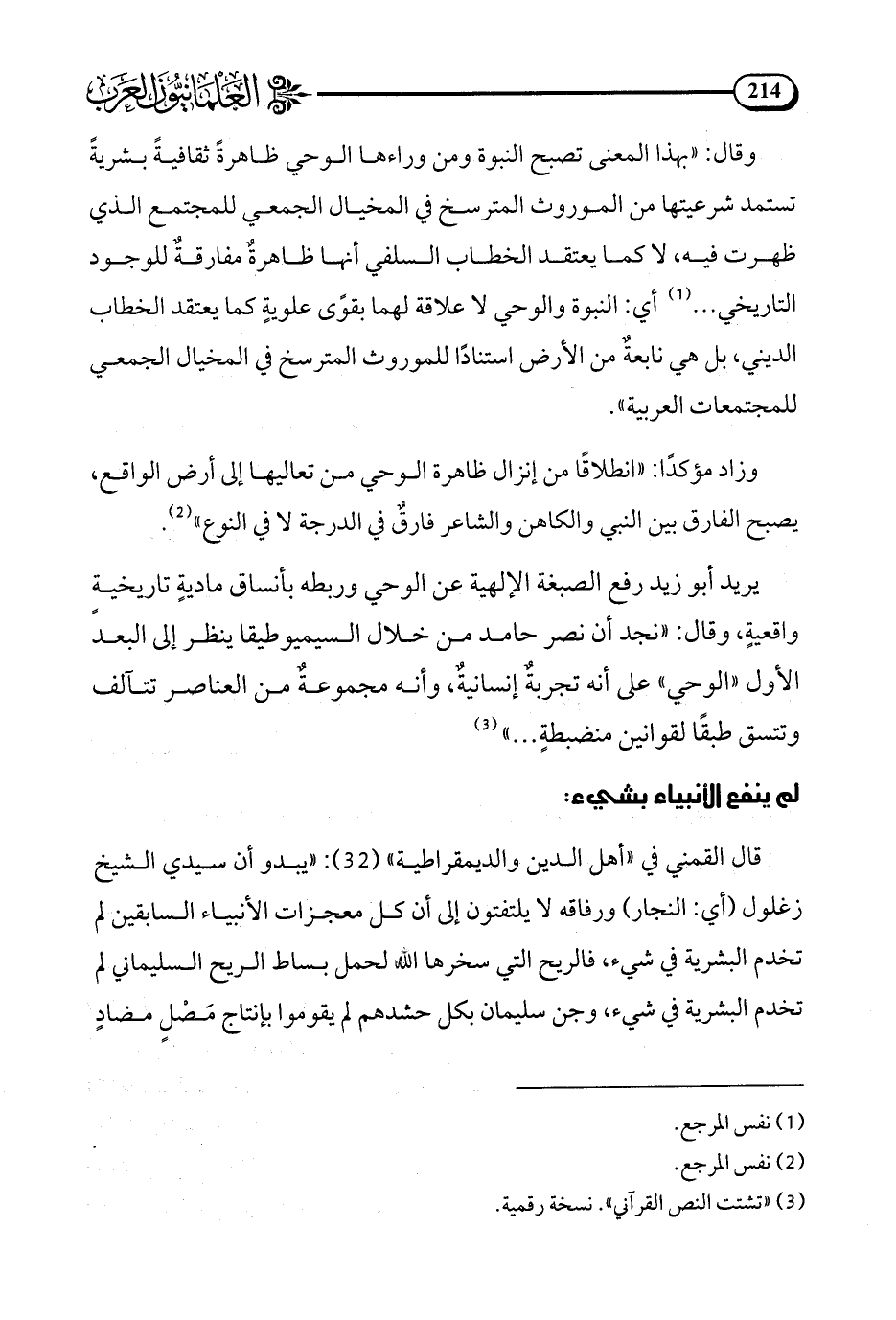 وقال: بهذا المعنى تصبح النبوة ومن وراءها الوحي ظاهرة ثقافية-بشرية تستمد شرعيتها من الموروث المترسخ في المخيال الجمعي للمجتمع الذي ظهرت فيه، لا كما يعتقد الخطاب السلفي أنها ظاهرة مفارقة للوجود التاريخي ... (¬1)