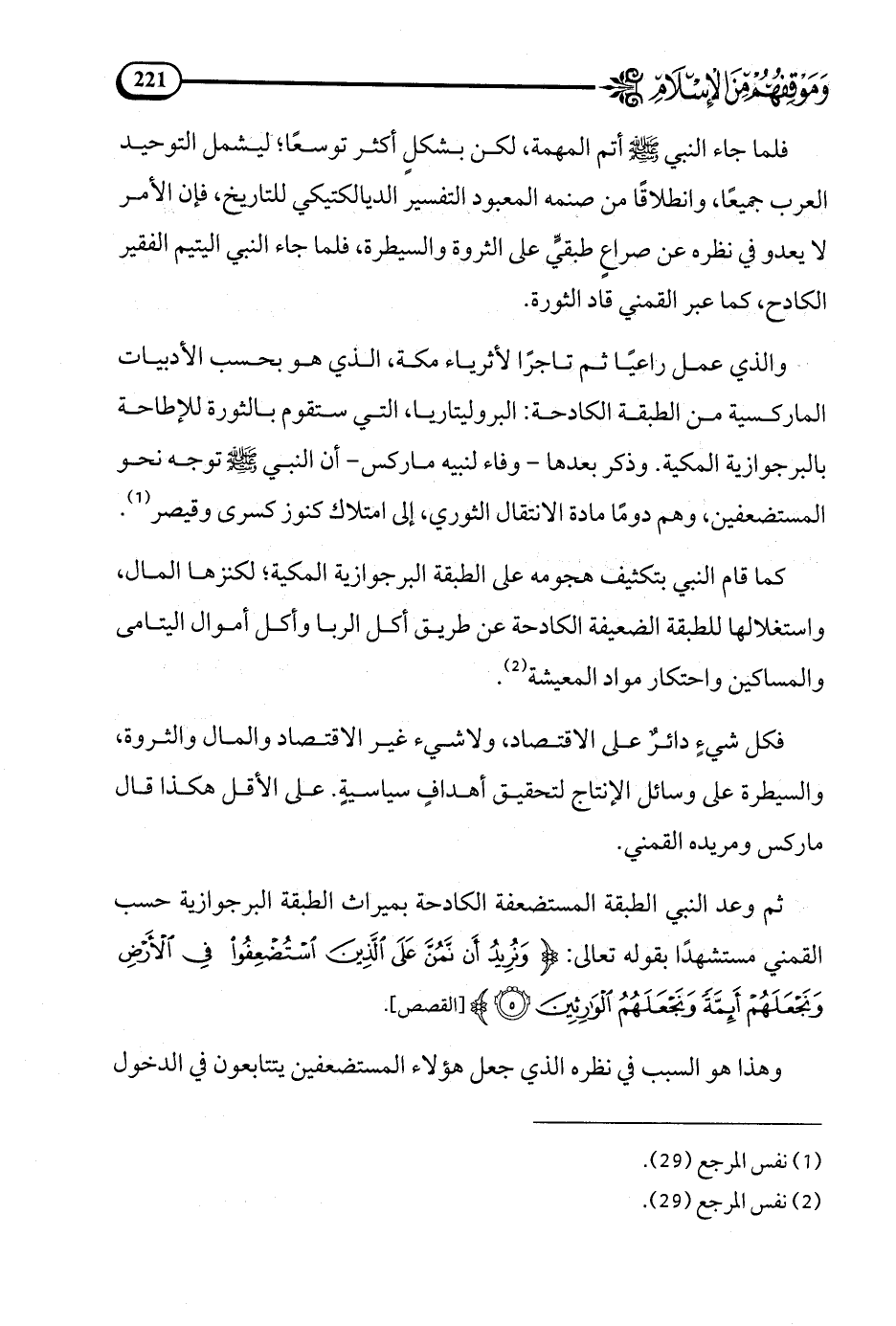 وذكر بعدها -وفاء لنبيه ماركس- أن النبي - صلى الله عليه وسلم - توجه نحو المستضعفين، وهم دوما مادة الانتقال الثوري، إلى امتلاك كنوز كسرى وقيصر (¬1).