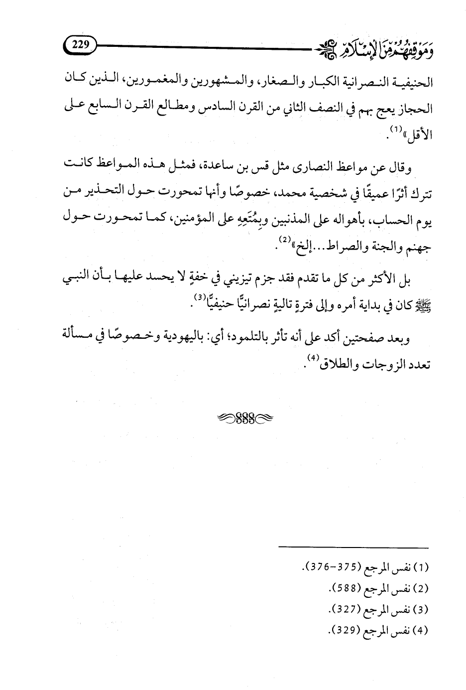 وقال عن مواعظ النصارى مثل قس بن ساعدة، فمثل هذه المواعظ كانت تترك أثرا عميقا في شخصية محمد، خصوصا وأنها تمحورت حول التحذير من يوم الحساب، بأهواله على المذنبين وبمتعه على المؤمنين، كما تمحورت حول جهنم والجنة والصراط ... إلخ (¬2).