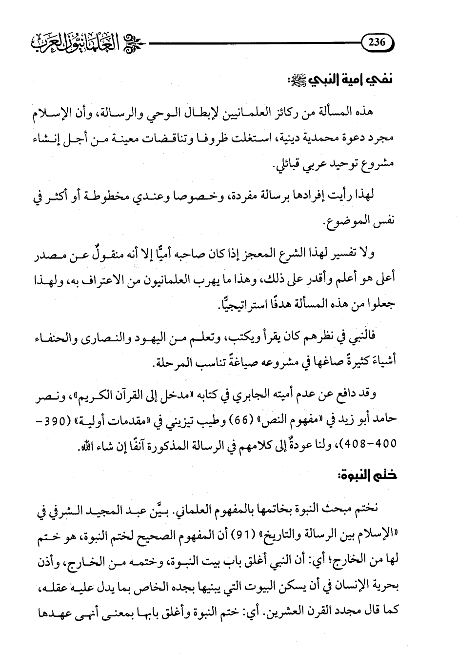 وقد دافع عن عدم أميته الجابري في كتابه مدخل إلى القرآن الكريم، ونصر حامد أبو زيد في مفهوم النص (66) وطيب تيزيني في مقدمات أولية (390 - 400 - 408).