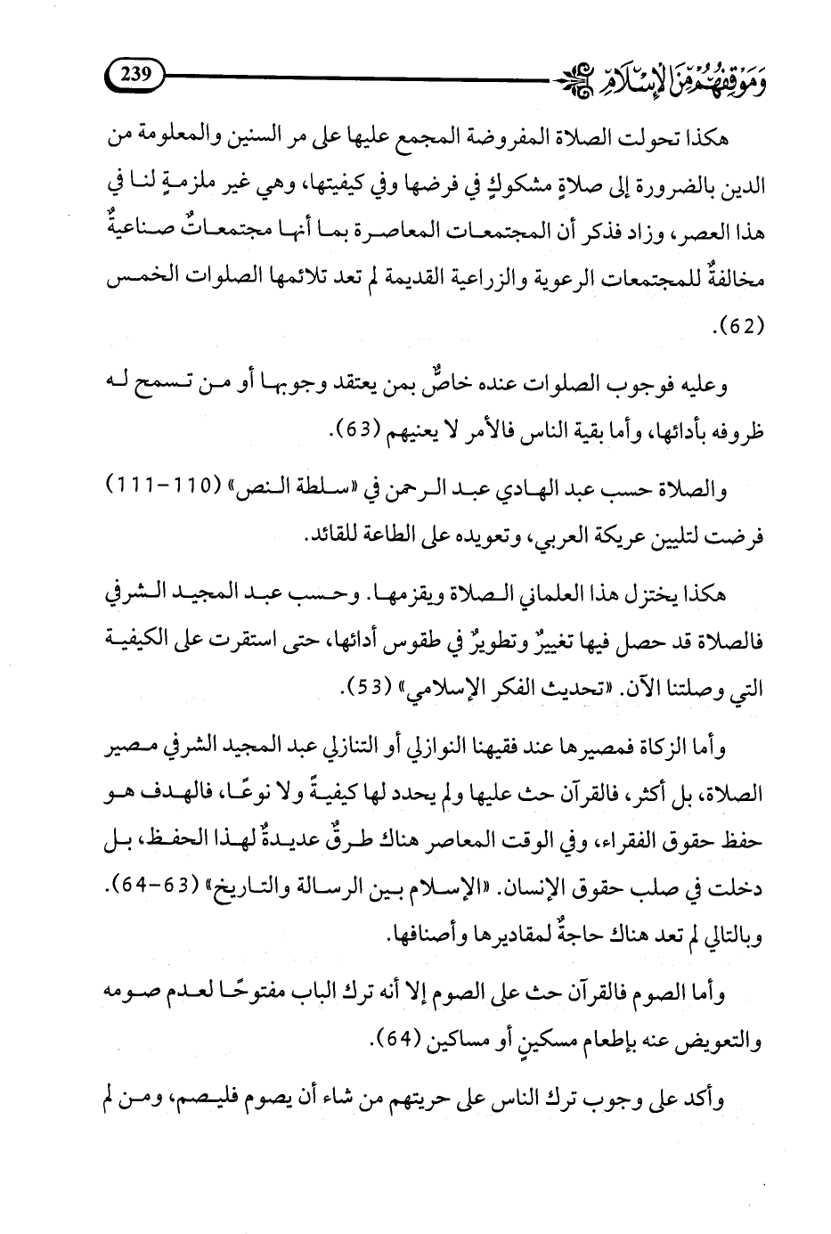 وزاد فذكر أن المجتمعات المعاصرة بما أنها مجتمعات صناعية مخالفة للمجتمعات الرعوية والزراعية القديمة لم تعد تلائمها الصلوات الخمس (62).
