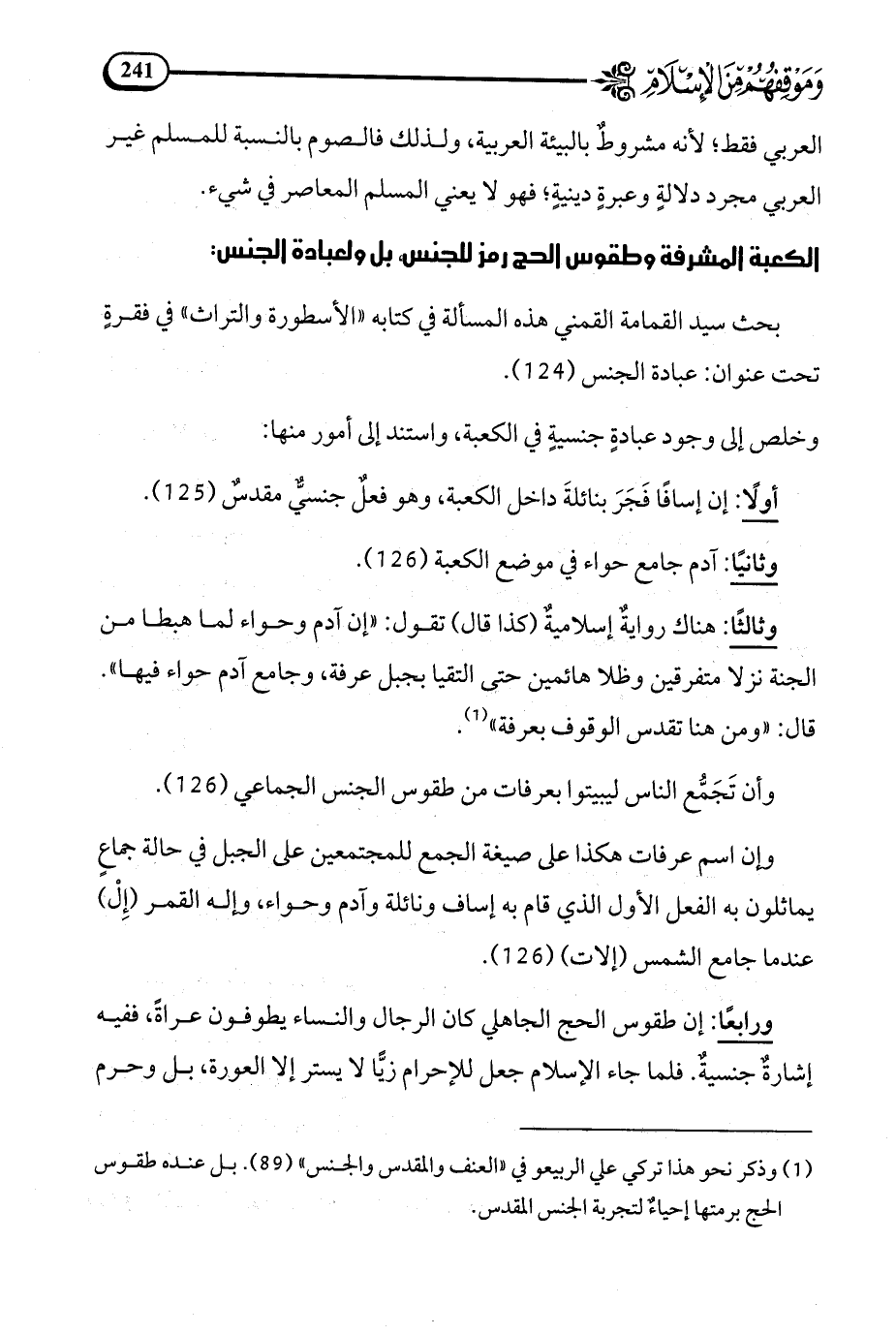 (¬1) وذكر نحو هذا تركي علي الربيعو في العنف والمقدس والجنس (89). بل عنده طقوس الحج برمتها إحياء لتجربة الجنس المقدس.