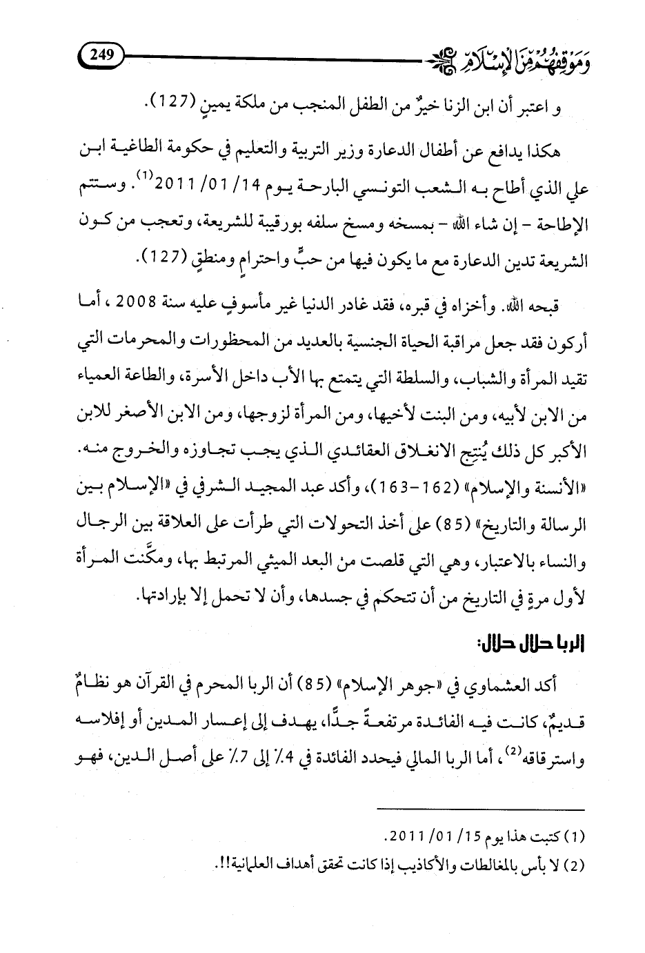 هكذا يدافع عن أطفال الدعارة وزير التربية والتعليم في حكومة الطاغية ابن علي الذي أطاح به الشعب التونسي البارحة يوم 14/ 01/2011 (¬1). وستتم الإطاحة إن شاء الله بمسخه ومسخ سلفه بورقيبة للشريعة.