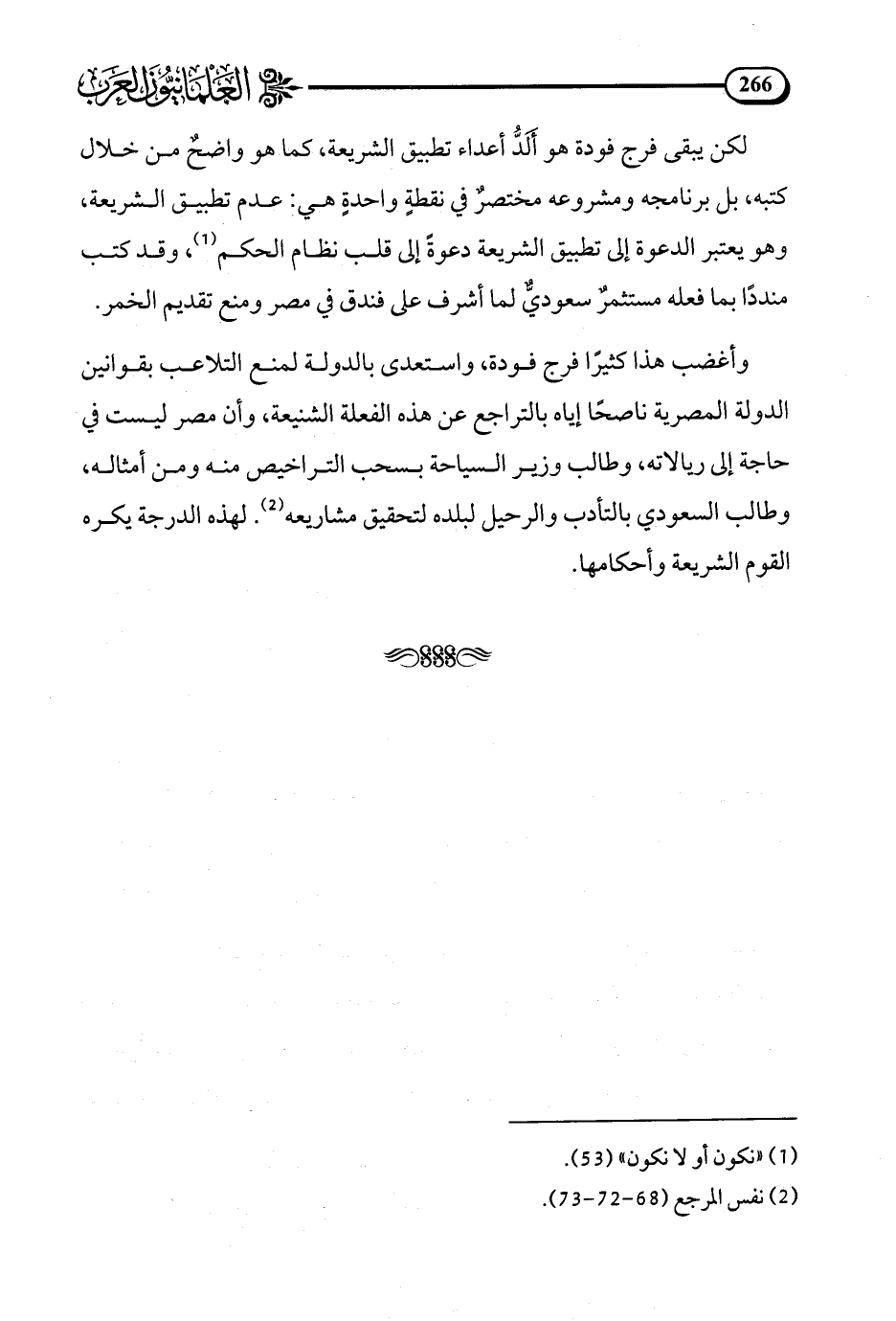 لكن يبقى فرج فودة هو ألد أعداء تطبيق الشريعة، كما هو واضح من خلال كتبه، بل برنامجه ومشروعه مختصر في نقطة واحدة هي: عدم تطبيق الشريعة.