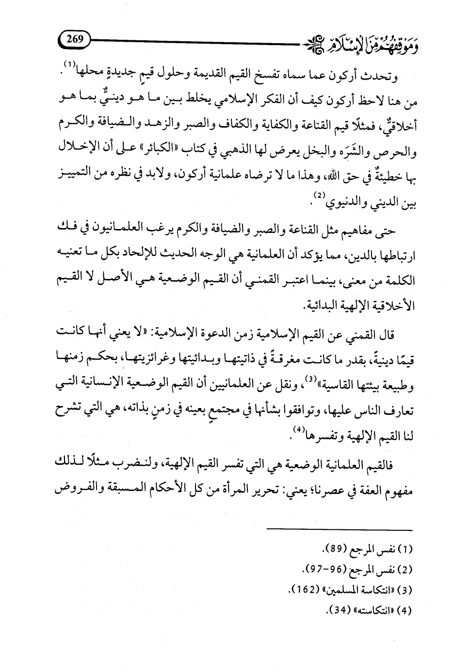 من هنا لاحظ أركون كيف أن الفكر الإسلامي يخلط بين ما هو ديني بما هو أخلاقي، فمثلا قيم القناعة والكفاية والكفاف والصبر والزهد والضيافة والكرم والحرص والشره والبخل يعرض لها الذهبي في كتاب الكبائر على أن الإخلال بها خطيئة في حق الله. وهذا ما لا ترضاه علمانية أركون، ولابد في نظره من التمييز بين الديني والدنيوي (¬2).
