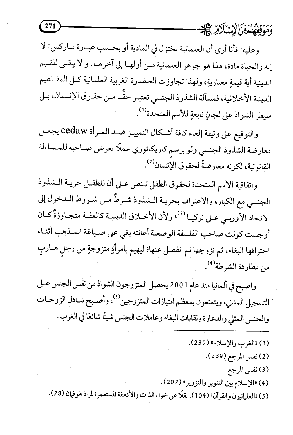(¬5) العلمانيون والقرآن (104). نقلا عن خواء الذات والأدمغة المستعمرة لمراد هوفمان (78).