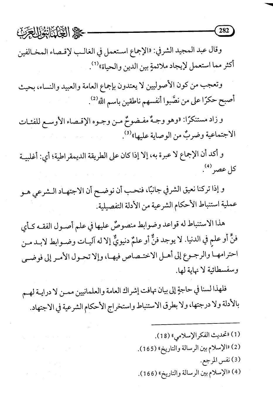 وتعجب من كون الأصوليين لا يعتدون بإجماع العامة والعبيد والنساء، بحيث أصبح حكرا على من نصبوا أنفسهم ناطقين باسم الله (¬2).