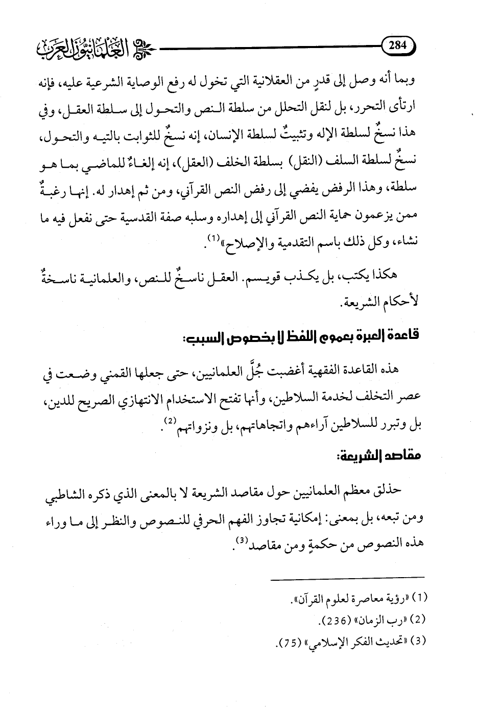حذلق معظم العلمانيين حول مقاصد الشريعة لا بالمعنى الذي ذكره الشاطبي ومن تبعه، بل بمعنى: إمكانية تجاوز الفهم الحرفي للنصوص والنظر إلى ما وراء هذه النصوص من حكمة ومن مقاصد (¬3).