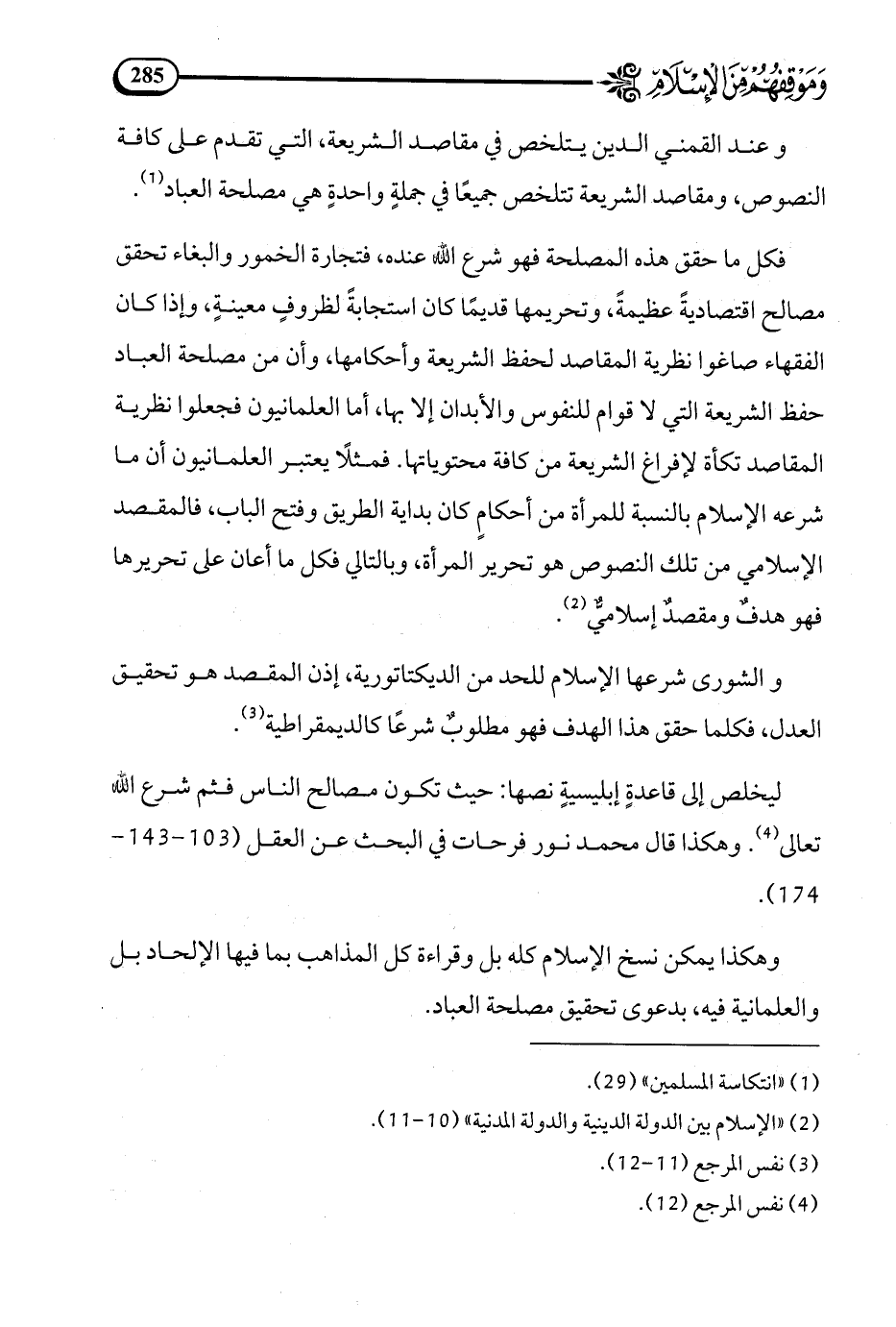 وعند القمني الدين يتلخص في مقاصد الشريعة، التي تقدم على كافة النصوص، ومقاصد الشريعة تتلخص جميعا في جملة واحدة هي مصلحة العباد (¬1).