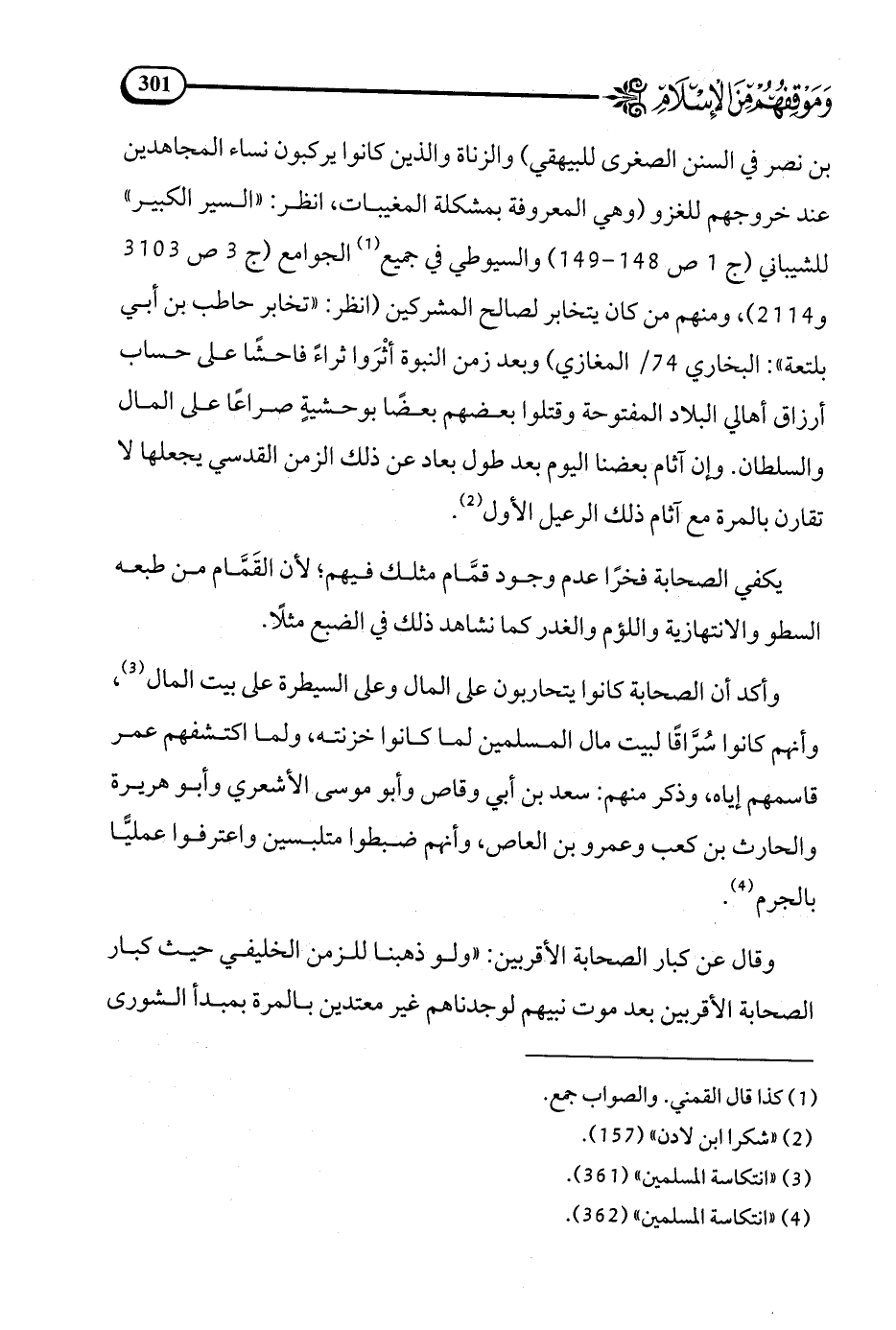 بن نصر في السنن الصغرى للبيهقي) والزناة والذين كانوا يركبون نساء المجاهدين عند خروجهم للغزو (وهي المعروفة بمشكلة المغيبات، انظر السير الكبير للشيباني ج 1 ص 148 - 149) والسيوطي في جميع (¬1) الجوامع ج 3 ص 3103 و2114)، ومنهم من كان يتخابر لصالح المشركين (انظر تخابر حاطب بن أبي بلتعة: البخاري 74/ المغازي) وبعد زمن النبوة أثْرَوا ثراء فاحشا على حساب أرزاق أهالي البلاد المفتوحة وقتلوا بعضهم بعضا بوحشية صراعا على المال والسلطان. وإن آثام بعضنا اليوم بعد طول بعاد عن ذلك الزمن القدسي يجعلها لا تقارن بالمرة مع آثام ذلك الرعيل الأول (¬2).