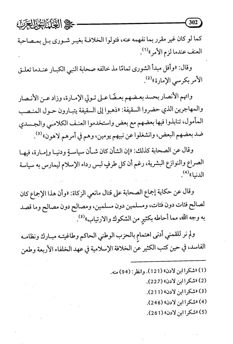 وقال: وأفل مبدأ الشورى تماما مذ خالفه صحابة النبي الكبار عندما تعلق الأمر بكرسي الإمارة (¬2).