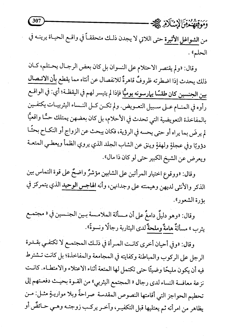 وقال: ولم يقتصر الاحتلام على النسوان بل كان بعض الرجال يحتلم كان ذلك يحدث إذا اضطرته ظروف قاهرة للانفصال عن أنثاه مما يقطع بأن الاتصال بين الجنسين كان طقساً يمارسونه يوميا فإذا لم يتيسر لهم في اليقظة أي: في الواقع رأوه في المنام على سبيل التعويض. ولم تكن كل النساء اليثربيات يكتفين بالمفاخذة التعويضية التي تحدث في الأحلام بل كان بعضهن يمتلك حساً واقعياً لم يرض بما يراه أو حتى يحسه في الرؤية فكان يبحث عن الزواج أو النكاح بحثاً دؤوباً وفي عجلة ولهفة وينق عن الشاب الجلد الذي يروي الظمأ ويعطي المتعة ويعرض عن الشيخ الكبير حتى لو كان ذا مال.