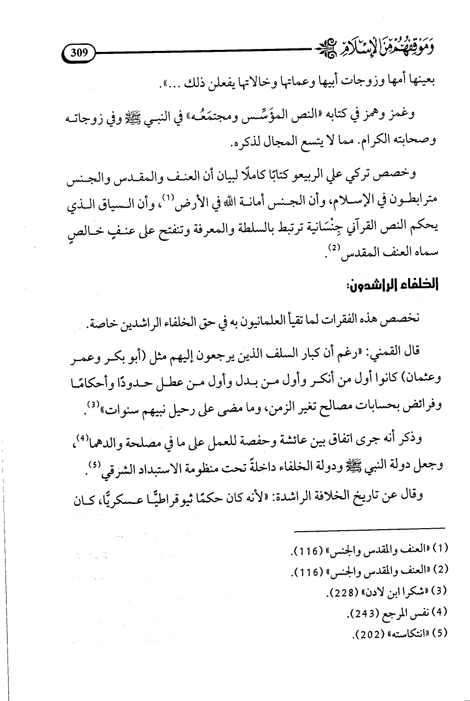وذكر أنه جرى اتفاق بين عائشة وحفصة للعمل على ما في مصلحة والدهما (¬4). وجعل دولة النبي - صلى الله عليه وسلم - ودولة الخلفاء داخلة تحت منظومة الاستبداد الشرقي (¬5).