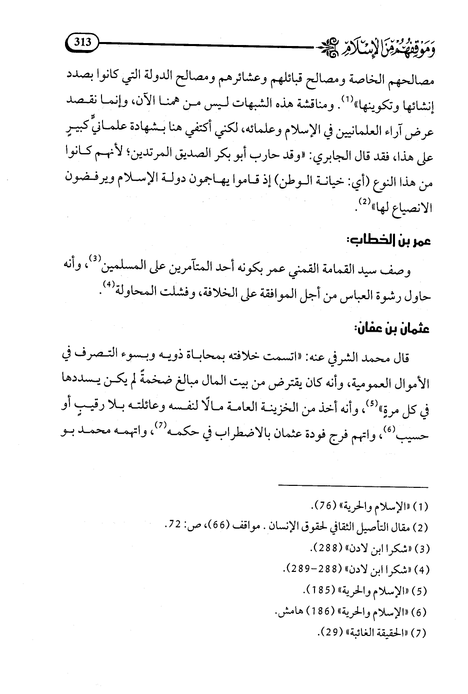 ومناقشة هذه الشبهات ليس من همنا الآن، وإنما نقصد عرض آراء العلمانيين في الإسلام وعلمائه، لكني أكتفي هنا بشهادة علماني كبير على هذا، فقد قال الجابري: وقد حارب أبو بكر الصديق المرتدين لأنهم كانوا من هذا النوع (أي: خيانة الوطن) إذ قاموا يهاجمون دولة الإسلام ويرفضون الانصياغ لها (¬2).