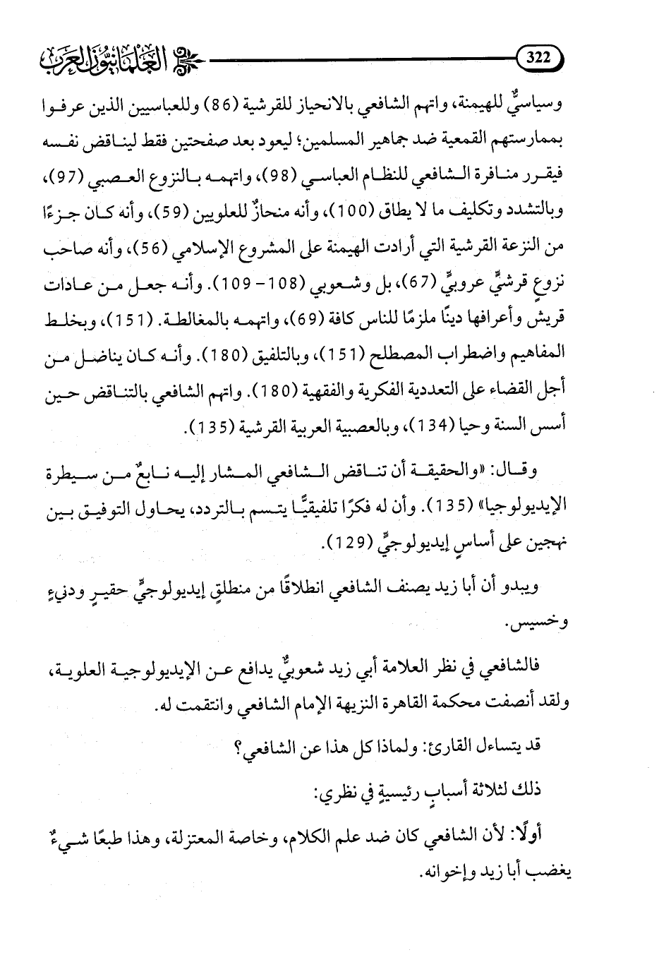 واتهم الشافعي بالانحياز للقرشية (86) وللعباسيين الذين عرفوا بممارستهم القمعية ضد جماهير المسلمين، ليعود بعد صفحتين فقط ليناقض نفسه فيقرر منافرة الشافعي للنظام العباسي (98).