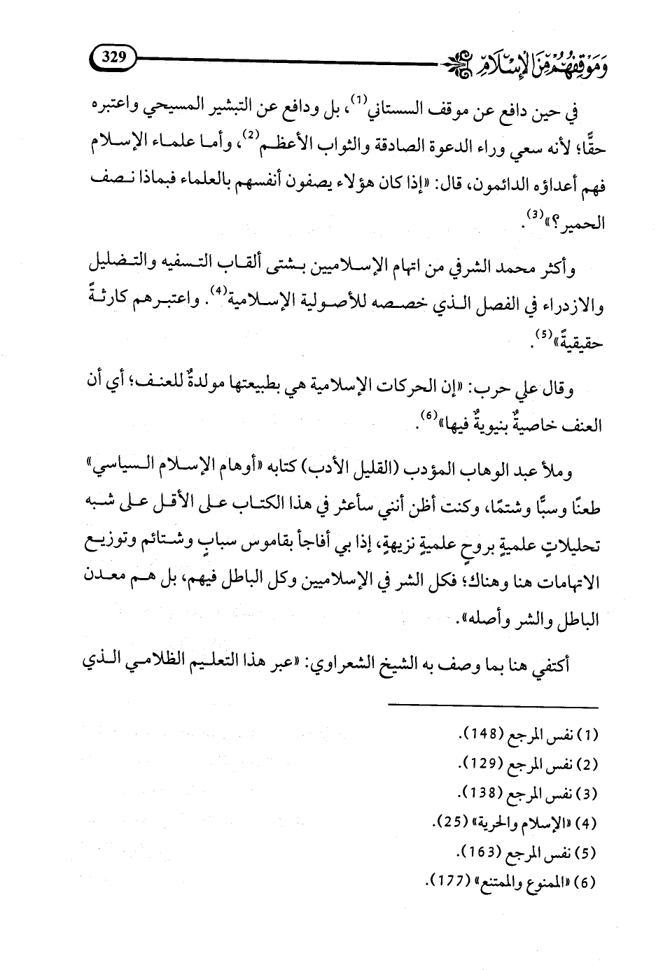 في حين دافع عن موقف السستاني (¬1). بل ودافع عن التبشير المسيحي واعتبره حقا لأنه سعي وراء الدعوة الصادقة والثواب الأعظم (¬2).