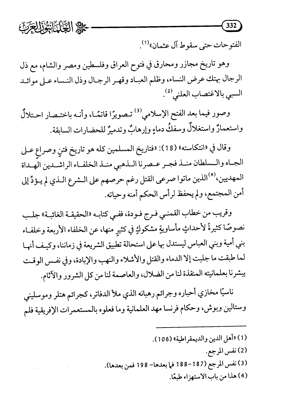 وقال في انتكاسته (18): فتاريخ المسلمين كله هو تاريخ فتن وصراع على الجاه والسلطان منذ فجر عصرنا الذهبي منذ الخلفاء الراشدين الهداة المهديين (¬4) الذين ماتوا صرعى القتل رغم حرصهم على الشرع الذي لم يؤد إلى أمن المجتمع ولم يحفظ لرأس الحكم أمنه وحياته.