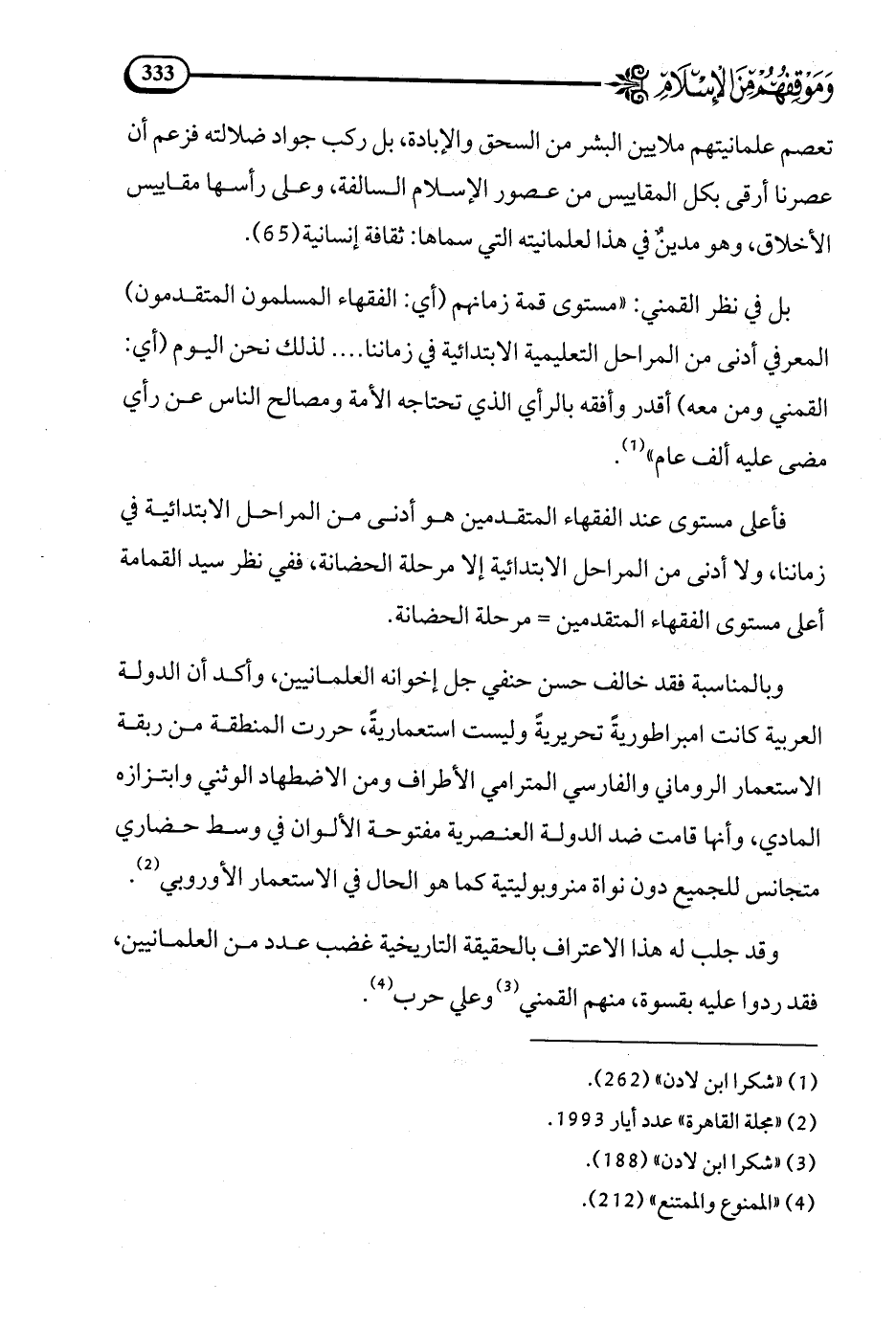 تعصم علمانيتهم ملايين البشر من السحق والإبادة، بل ركب جواد ضلالته فزعم أن عصرنا أرقى بكل المقاييس من عصور الإسلام السالفة، وعلى رأسها مقاييس الأخلاق، وهو مدين في هذا لعلمانيته التي سماها ثقافة إنسانية (65).