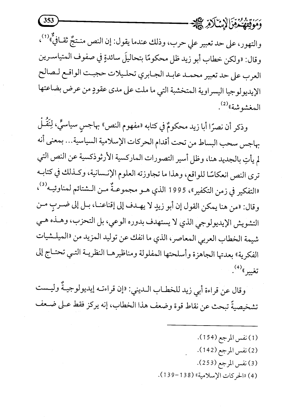 وقال: ولكن خطاب أبو زيد ظل محكوما بتحاليل سائدة في صفوف المتياسرين العرب على حد تعبير محمد عابد الجابري تحليلات حجبت الواقع لصالح الإيديولوجيا اليسراوية المتخشبة التي ما ملت على مدى عقود من عرض بضاعتها المغشوشة (¬2).