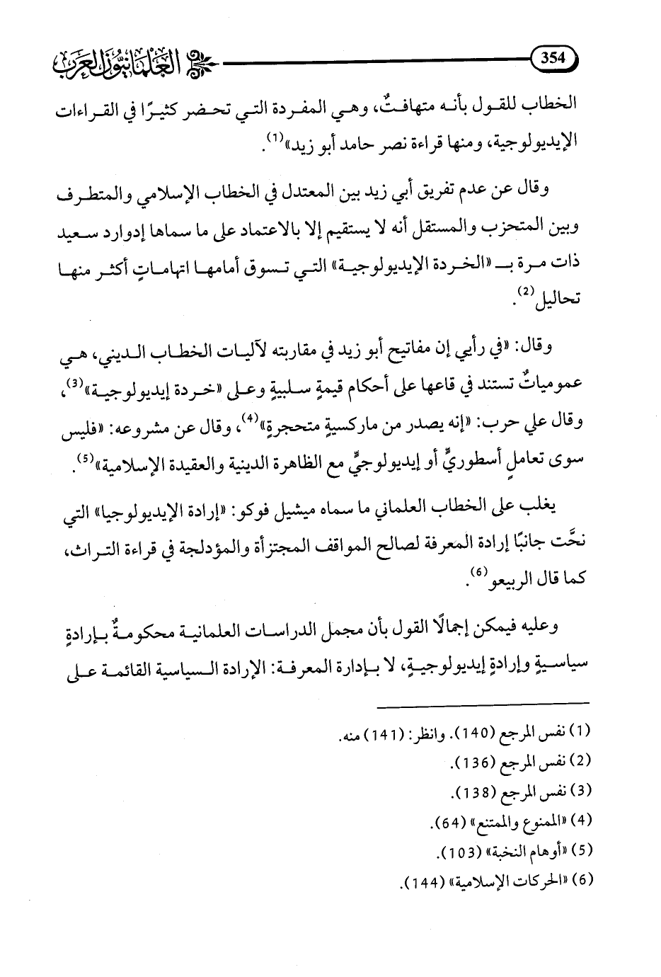 وقال: في رأيي إن مفاتيح أبو زيد في مقاربته لآليات الخطاب الديني، هي عموميات تستند في قاعها على أحكام قيمة سلبية وعلى «خردة إيديولوجية» (¬3).